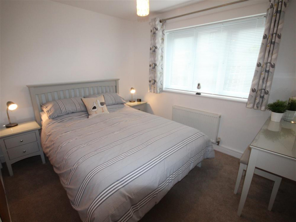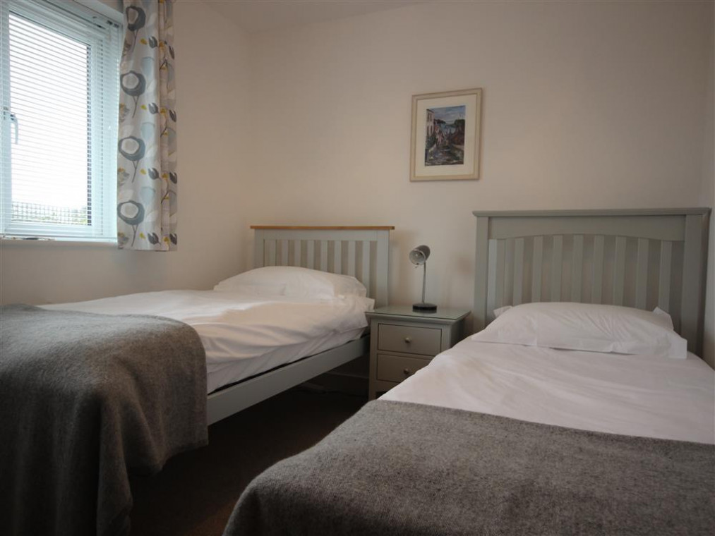 Next to the lounge is the attractively presented double bedroom with king size bed and ample built in wardrobe space to serve both bedrooms. The pretty twin bedroom with full size single beds is at the front of the property with a small dressing table built in.