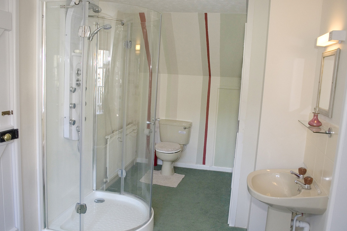Three bedrooms: one ground twin (link-able to a super king-size double on request), with en-suite bathroom, bath, shower over, basin and WC and one first floor double with en-suite bathroom with bath, shower over, basin and WC. First floor single bedroom. First floor sitting room. Ground floor kitchen with dining room. Utility room.