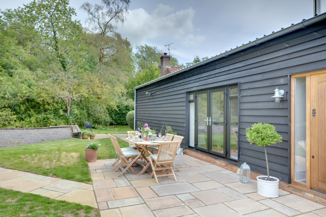 Outdoor: Enclosed garden with patio area, garden furniture, bench and charcoal barbecue