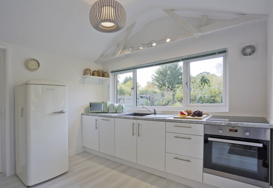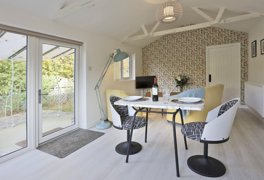 - Utilities: Electric oven and hob, fridge/freezer, dishwasher, microwave, table and chairs for 2
