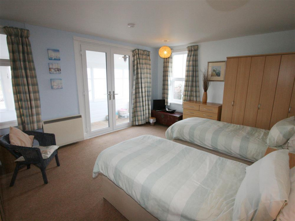 A small hallway to one side of the sitting room gives access to a bathroom W.C. with vanity basin and a shower over the bath and two bedrooms. There is a twin bedded room with sea views and French Doors opening to the verandah, and a double bedroom with a 5' kingsize bed which has direct access to a utility area with sink, a W.C. and a shower room with hand basin.