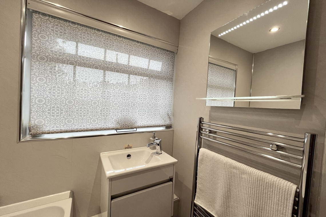 Modern bathroom with rainfall shower & extra wide bathtub, shower point, heated towel rail and illuminated bathroom mirror