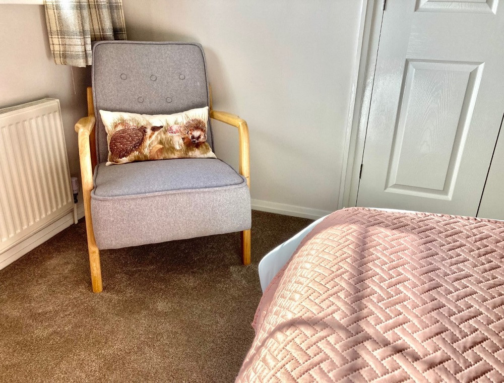 King size bed in very spacious bedroom, built in wardrobes with mirrors, dressing table and mirror, reading chair and lined curtains to keep out the light