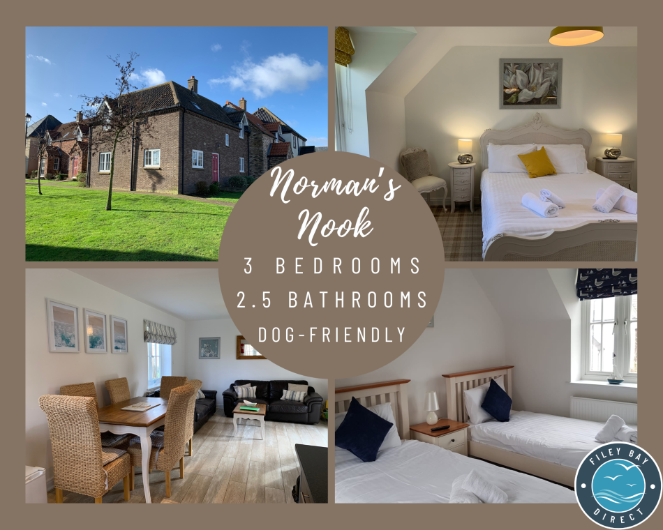 Norman's Nook is new to Filey Bay Direct in March 2024, after an extensive programme of redecoration and refurbishment. It is situated on The Parade, close to other properties, with a quiet south-facing patio which opens onto a communal boules court. Parking bays nearby on Green Close and Woodsping Way (first come first served). Enter through the front door into a hallway with stairs up, and downstairs cloakroom. To your left is a door through to the open plan living space, with kitchen, dining table and chairs, sofas, and large wall-mounted smart TV. French doors in the lounge area lead to the private patio with wooden furniture, brick built BBQ (disposables recommended) and sunny outlook across the boules court. To the right is the downstairs bedroom with TV and storage, ideal for anyone with mobility issues. Upstairs are 2 further bedrooms - the main king size bedroom with TV, storage, and its own ensuite shower room, and a twin bedroom. There is also a larger than average family bathroom with bath and a shower over. Please note: the fridge is an under-counter fridge with ice box. A separate worktop freezer is available (we will set up for you) as an optional extra.