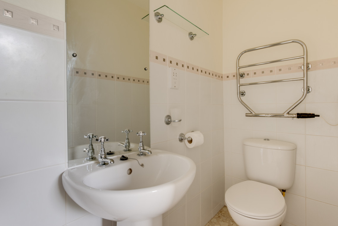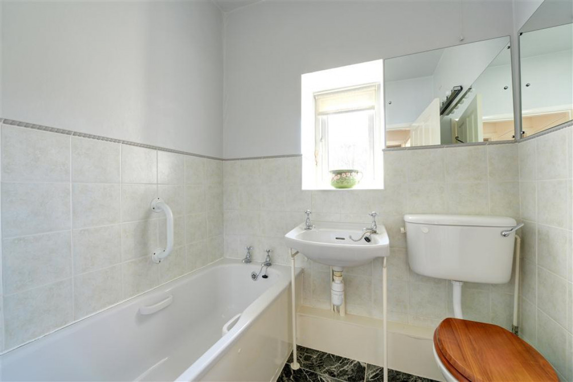 Outdoors: Lawned garden with mature shrubs shared with neighbour but with private seating areas