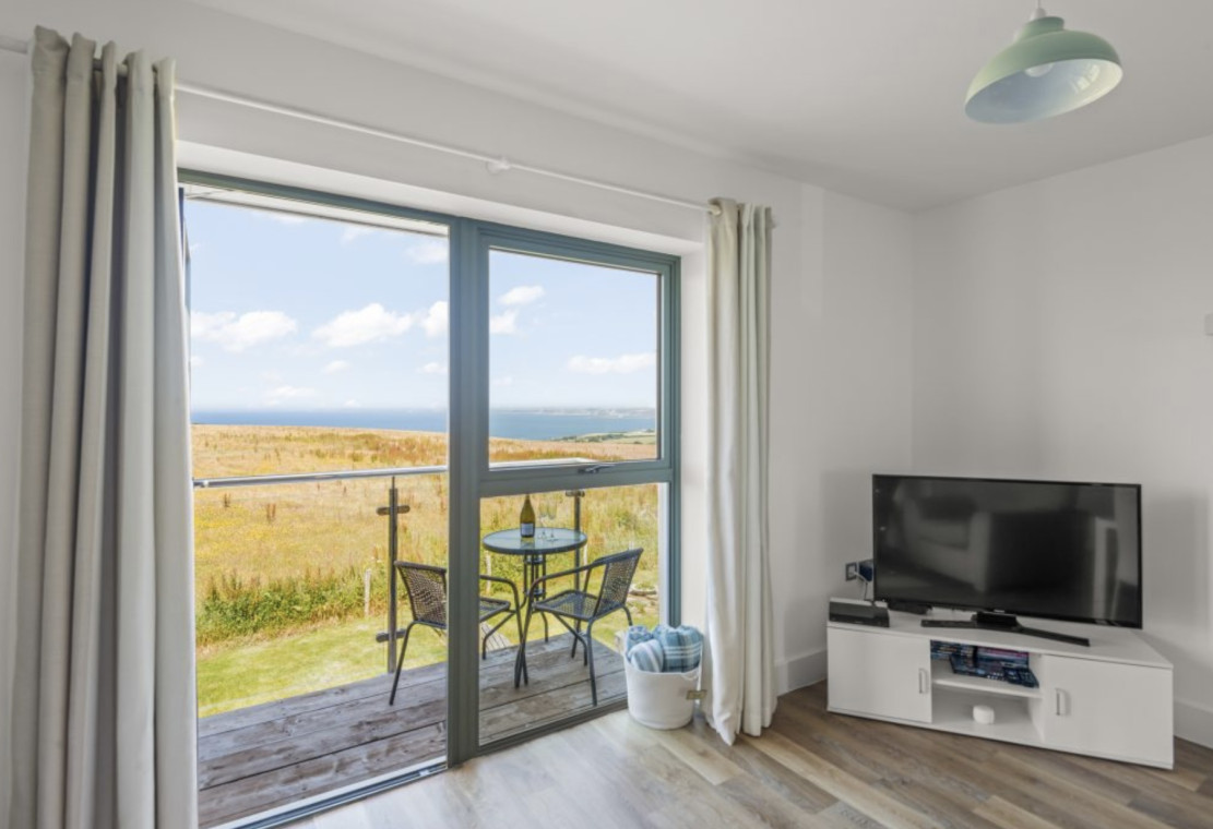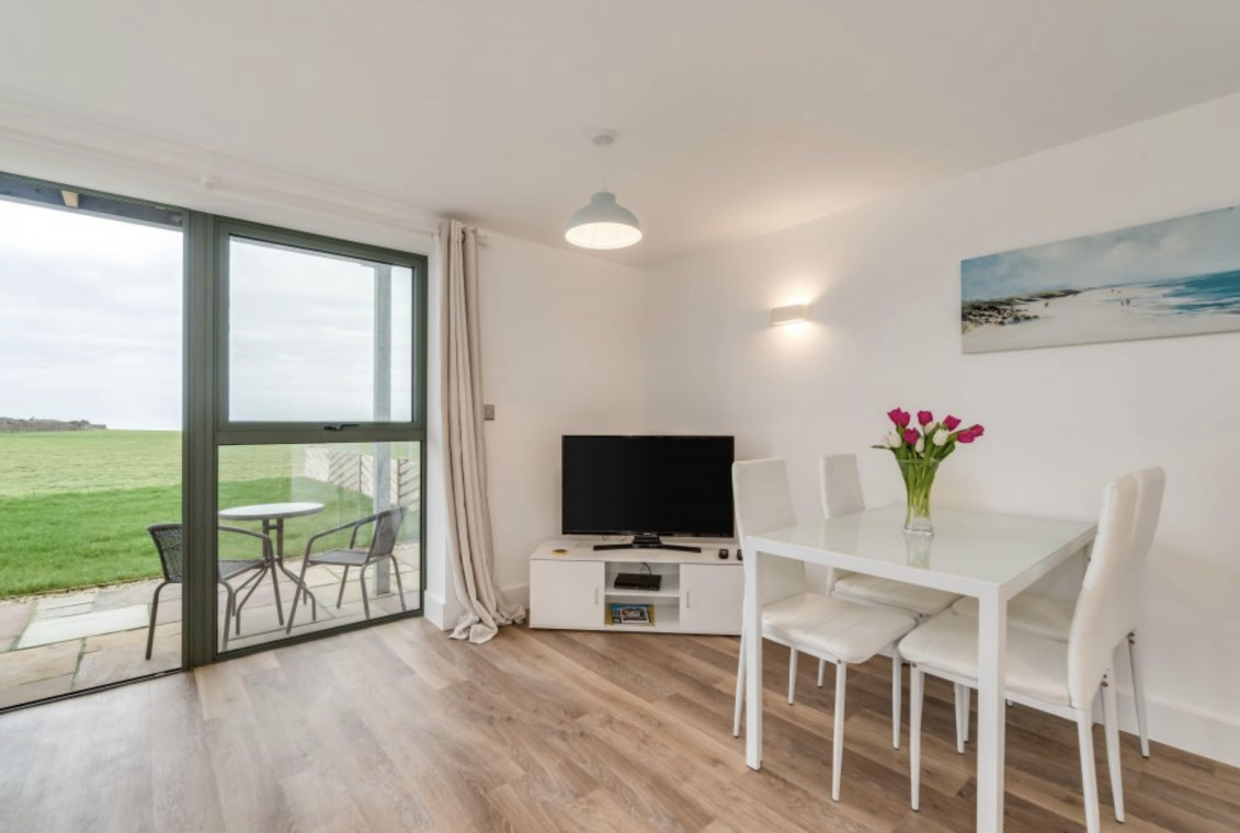 Nine Ocean Reach is a ground floor one bedroom apartment. The property is popular with wheelchair users. The bathroom has a walk in shower with grab rails, there are also grab rails alongside the toilet. The open plan living kitchen area leads out into an enclosed garden with superb countryside and coastal views. There is a sofa bed in the living area for 1 or 2 more people.