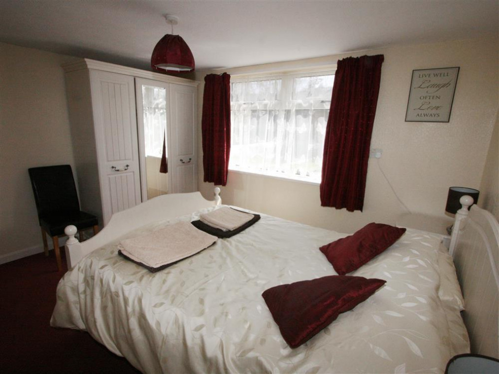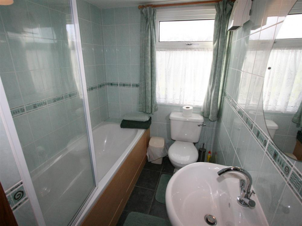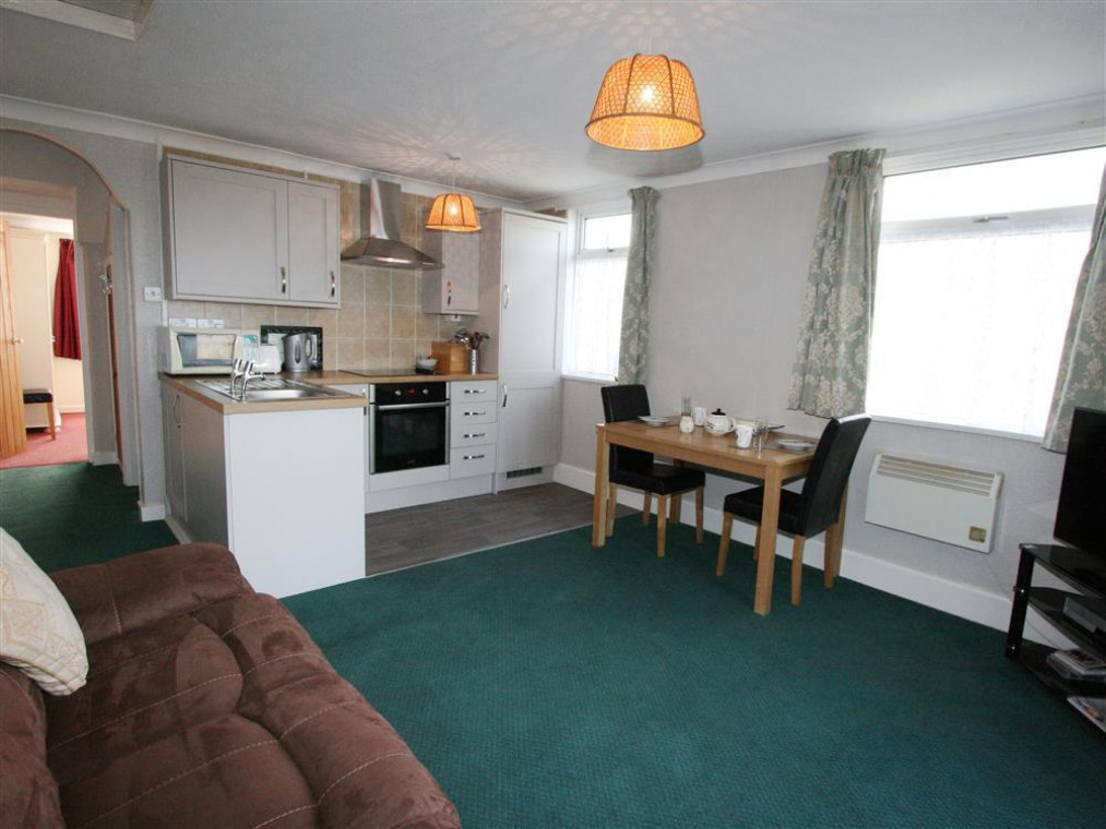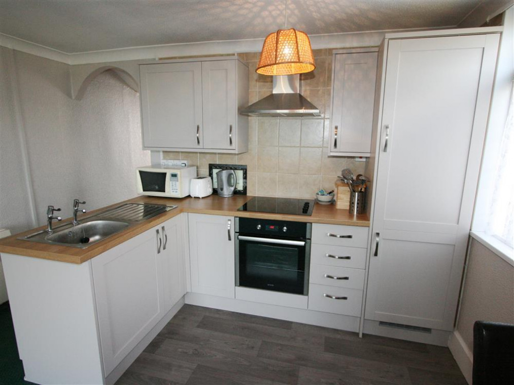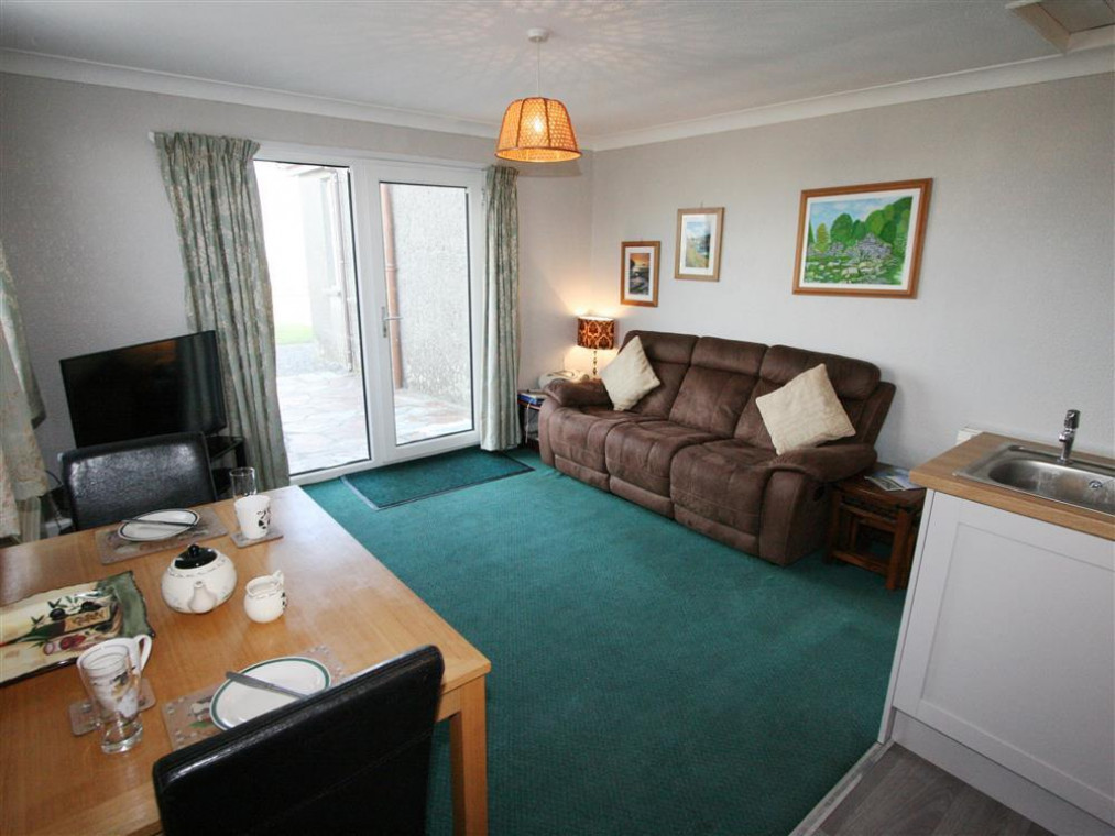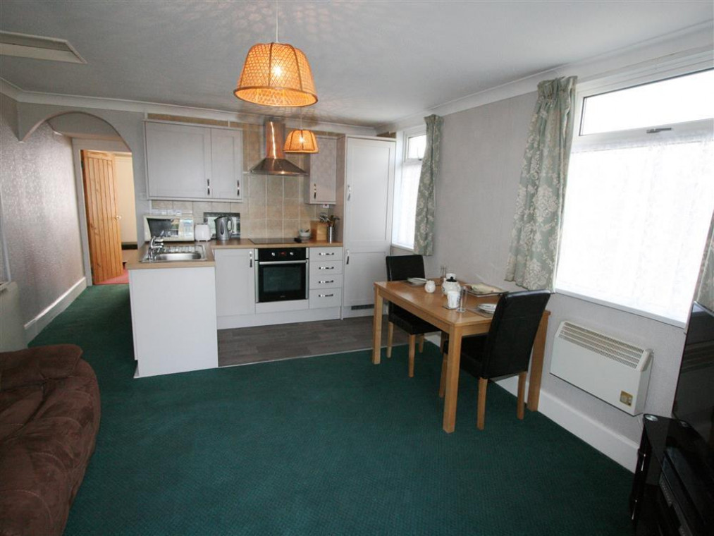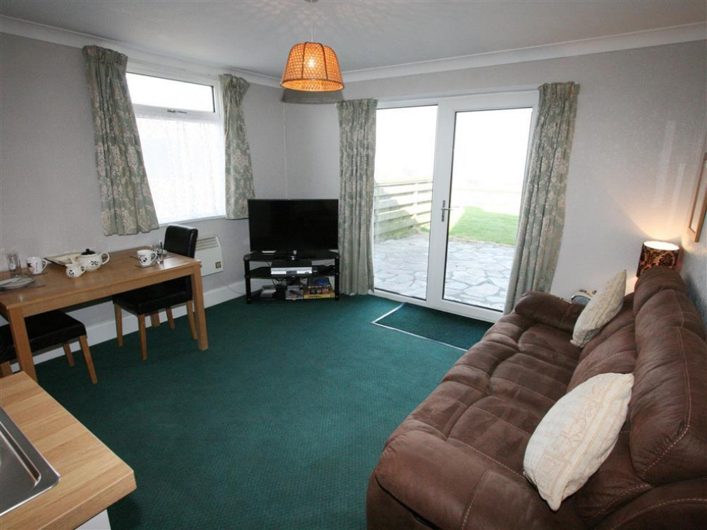 Approached from its own parking space, one step leads up to the double glazed patio doors which open directly into the cosy living room consisting of comfortable lounge seating, a dining suite and a newly fitted kitchen area. Beyond the living room at the rear of the property is a bright and sunny double bedroom and a fully tiled bathroom W.C. with hand basin and shower over the bath.