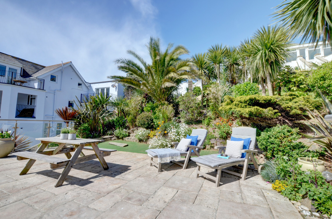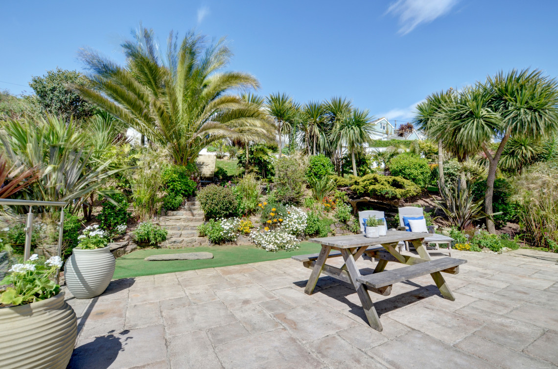 Outdoors: Terraced garden and two raised terraces with garden furniture