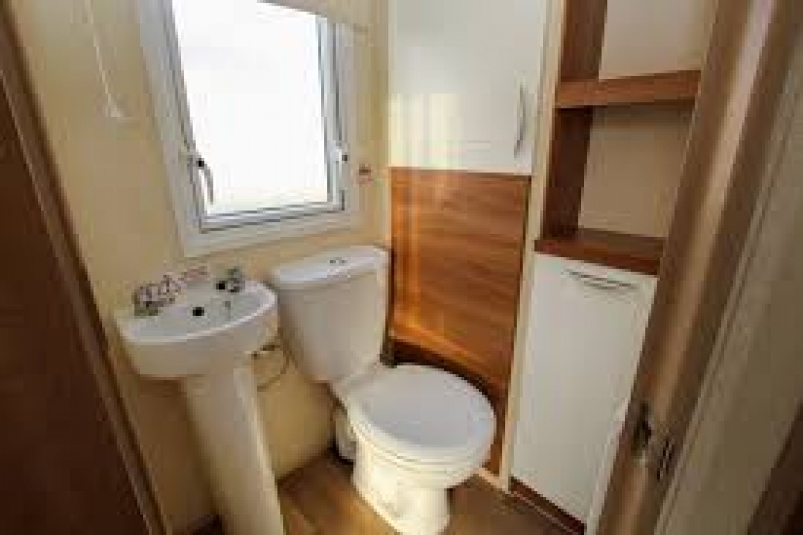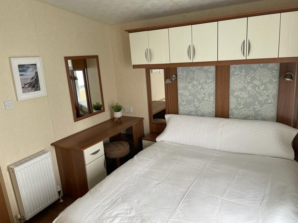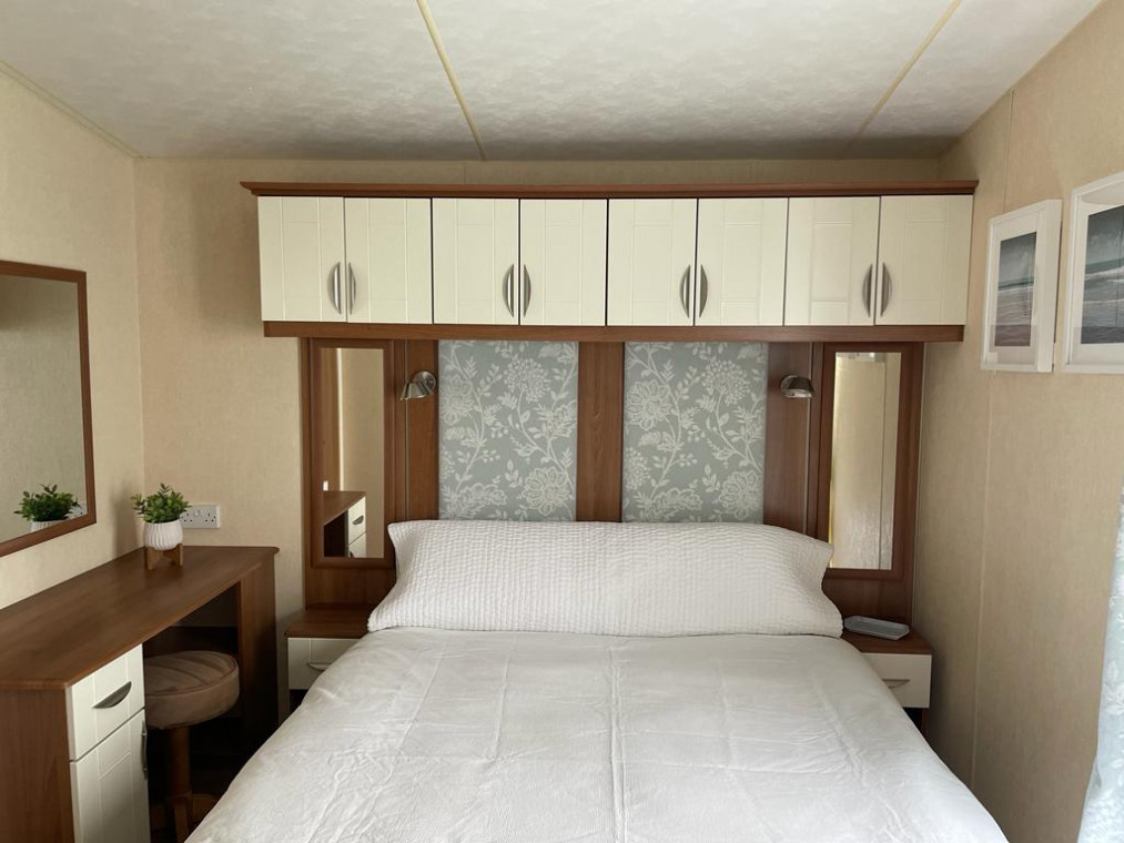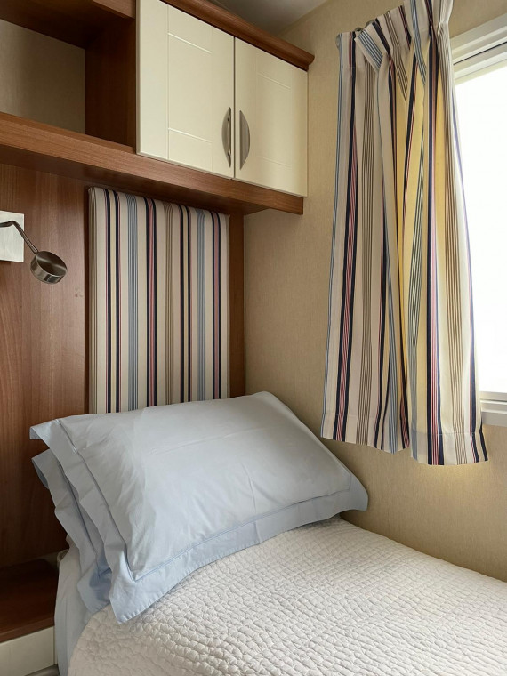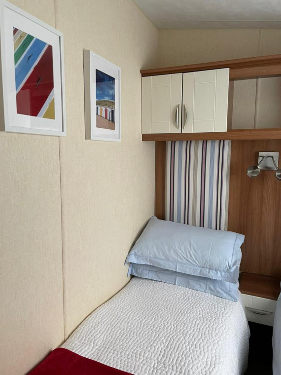 The twin bedroom is at the rear of the caravan and so you can sit outside on the decking with a glass of wine not having to worry about disturbing the little ones as they sleep. In this room, there is overhead storage and a wardrobe with mirror. There is also a mirror with plug socket for styling your hair.