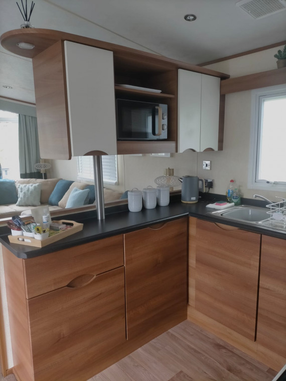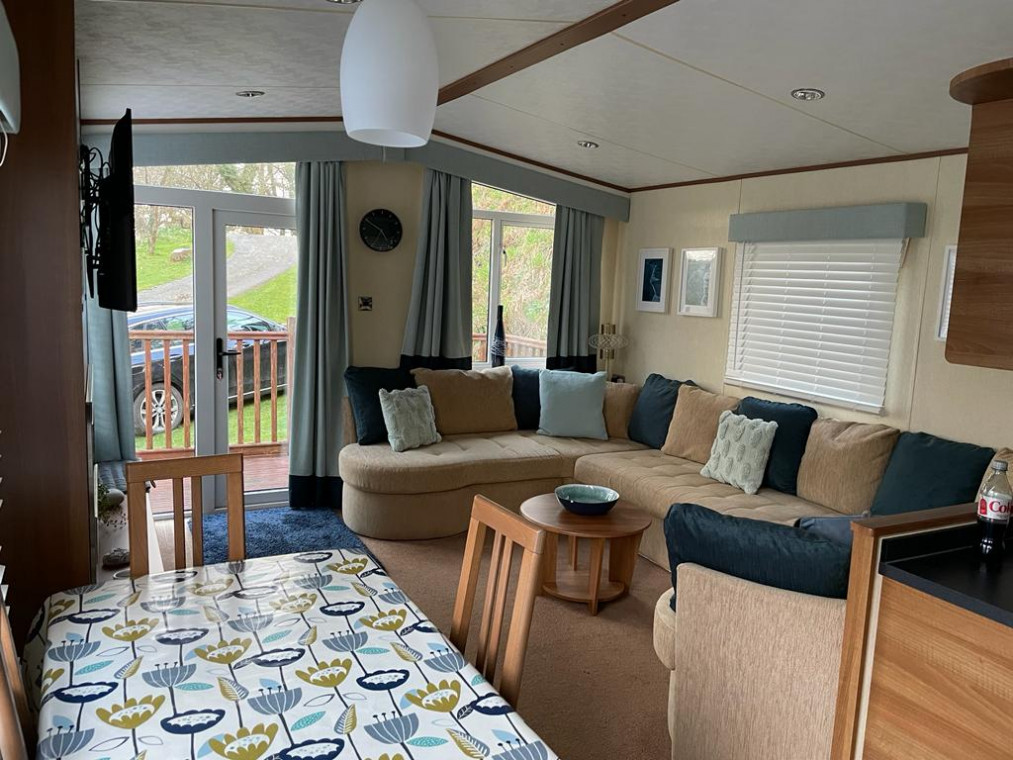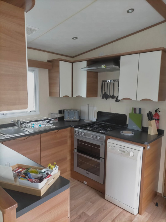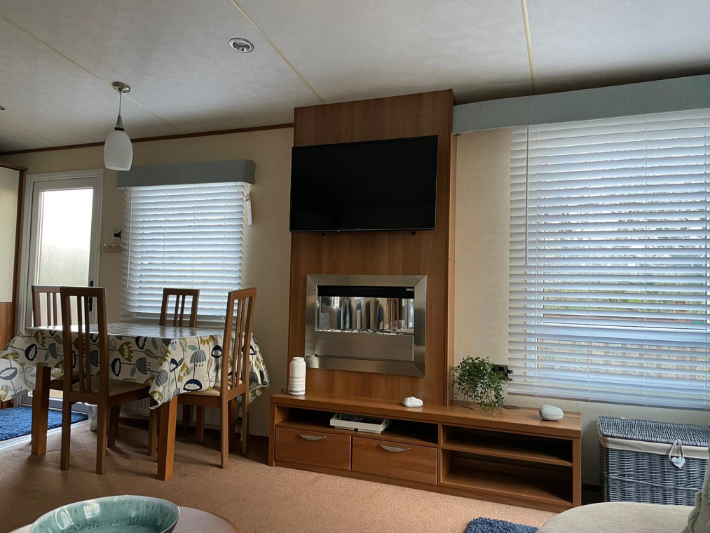 The caravan is a generous 36' x 12' with a large spacious living room which sits six easily and houses a pull out double bed. With a lovely modern fire, nights can be cosy while watching the 40" Smart TV with Netflix, Amazon Prime and lots of streaming apps included. There is also free wifi included too.