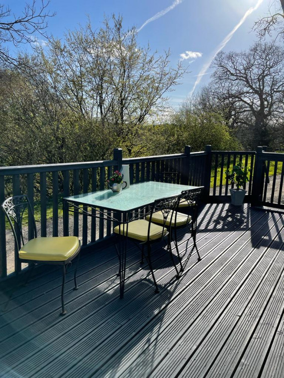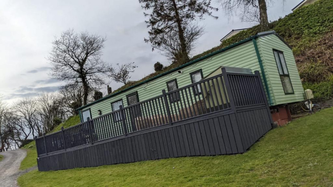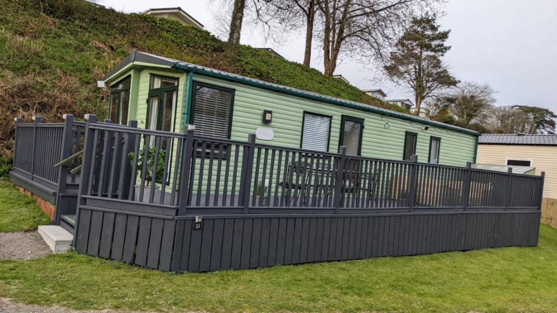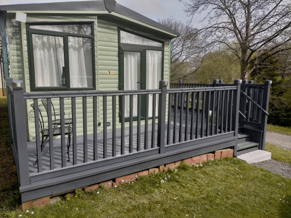 Dog-friendly 6 berth caravan with wrap around enclosed decking, free WiFi, Smart TV with Apps, en-suite master bedroom with TV and fully fitted kitchen. Quiet spot with direct access to Tarka Trail & dog exercise area.