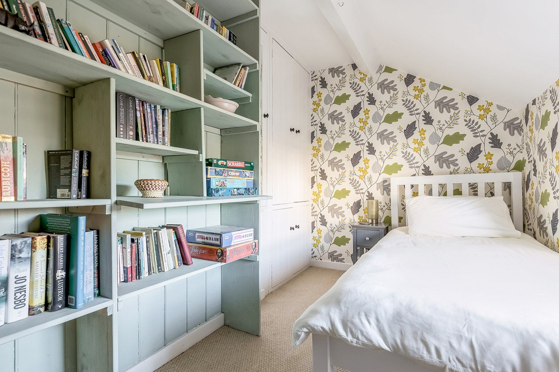 The pièce de résistance on this floor is the bathroom, with its sparkling modern suite with shower over bath and an amazing wall of obscured, coloured glass squares. Up another short flight of stairs, there is a third bedroom in the eaves. This room has limited headroom and the double bed is a low, contemporary design, set in a frame of dark wood with integral bedside tables. Everything in the cottage was squeaky clean. We could see that a good deal of thought had been put into making the best use of the space and there are a number of quirky knick-knacks and interesting artworks about the place which make it homely, without feeling cluttered. The cottage also boasts many original features and beams, along with a lot of Mind Your Head signs! Each of the cottages has a small garden on the other side of the path which leads past the front doors. Ours was a well-fenced, private space of neatly mown grass, with a table and four chairs, barbecue and washing line. We’d intended to visit the local pub on our first evening but, having got ourselves ensconced in the cosy lounge, the idea quickly lost its appeal. Instead, we opted to rustle something up in the kitchen and found the drawers and cupboards well-stocked with everything we could possibly need in the way of crockery, pots, pans and utensils. All was neatly arranged and no rummaging was required.