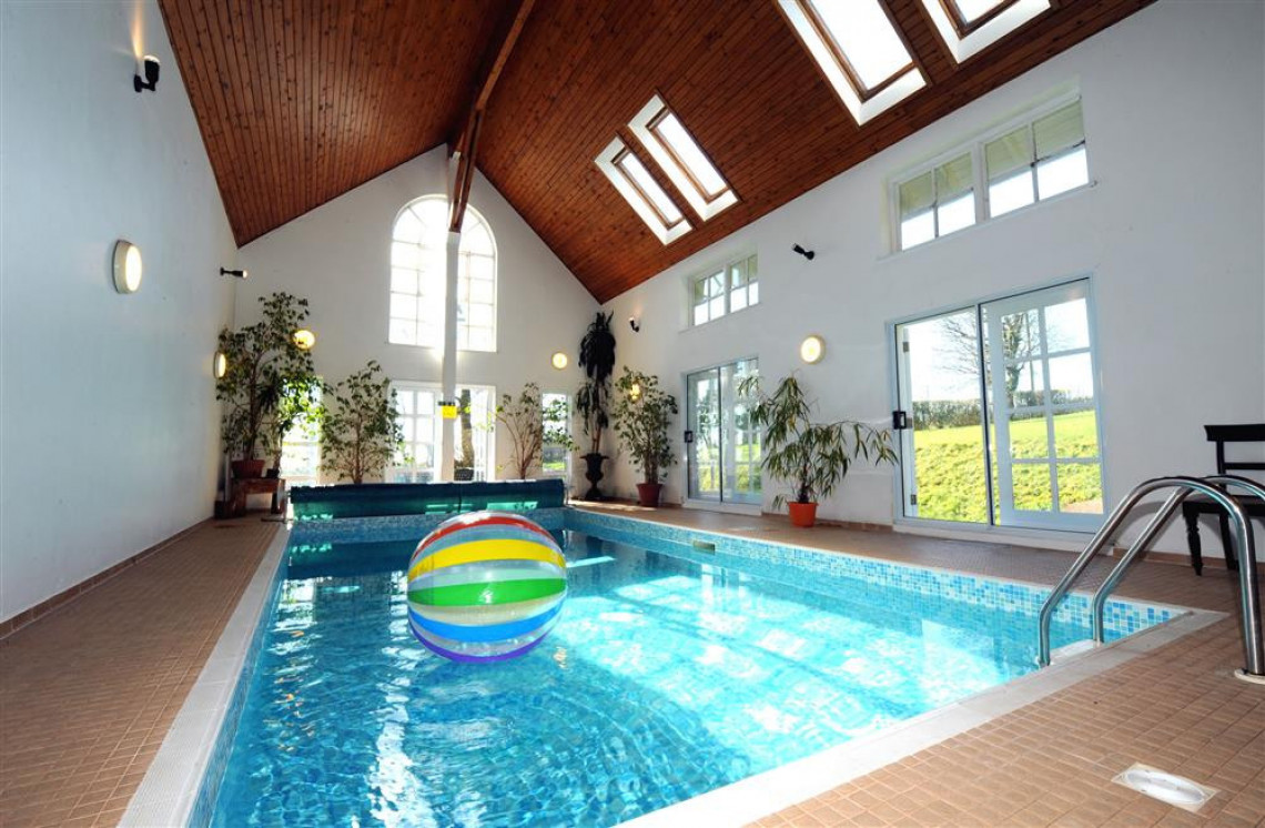 Outdoors: Large landscaped gardens surrounding the house; From the indoor heated swimming pool, the doors lead out to a boarded and paved terrace with garden furniture; very large lawn with garden furniture and sun umbrellas; portable charcoal BBQ; netball hoop; track from garden to beach; garden pavilion with summerhouse; use of adjoining fields for picnics, rambling and kite flying