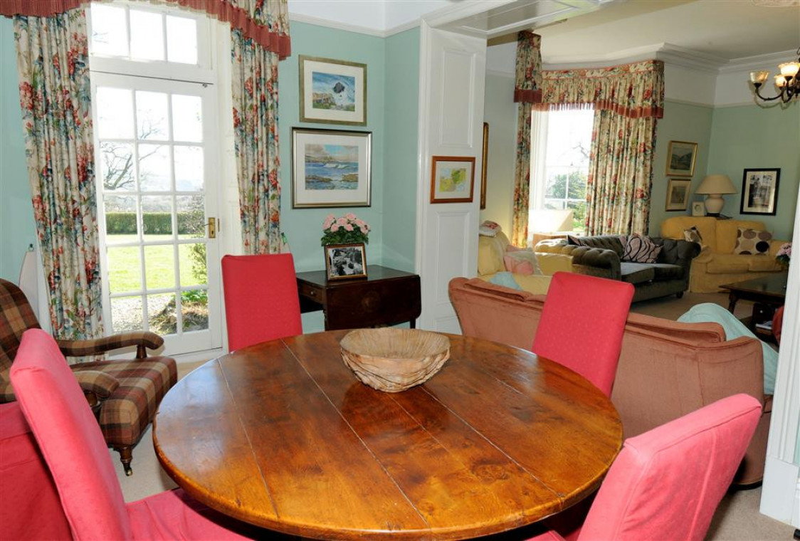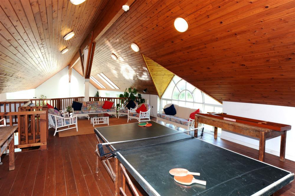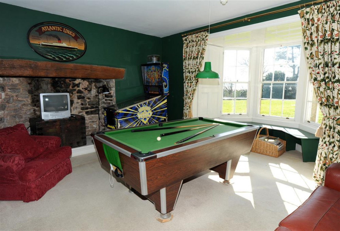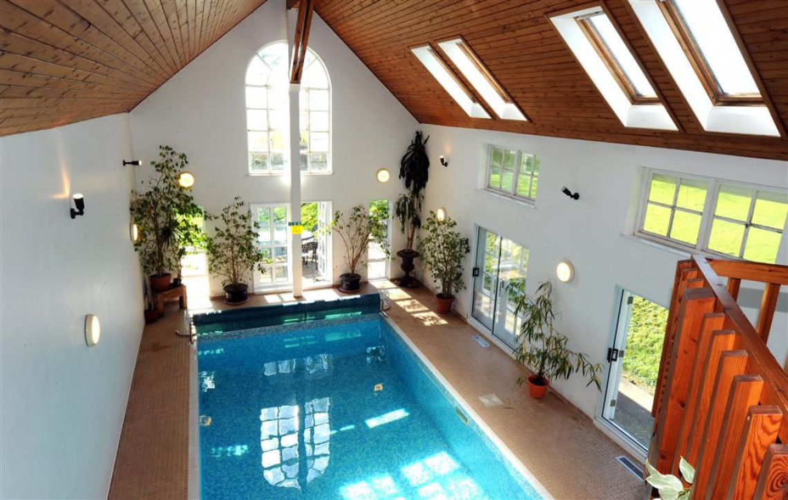 Rooms: Drawing room, library, children's lounge with pinball and pool table, dining room, kitchen, utility room, cold room (with wine racks and deep-freeze), 2 double bedrooms, master king size bedroom suite with en suite bathroom, double bedroom with en suite shower room, family bathroom with WC, separate WC, double bedroom with en suite bathroom, single bedroom, twin bedroom, bedroom with three single beds and en suite bathroom, WC on the wing landing, ground floor single bed-sitting room, indoor heated swimming pool and sauna (also toilet and shower), indoor sun balcony overlooking pool