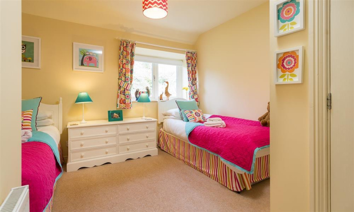The king-size room has a New England nautical twist with a TV while the other twin-bedded room is a glorious riot of colour aimed at the younger members of your party.