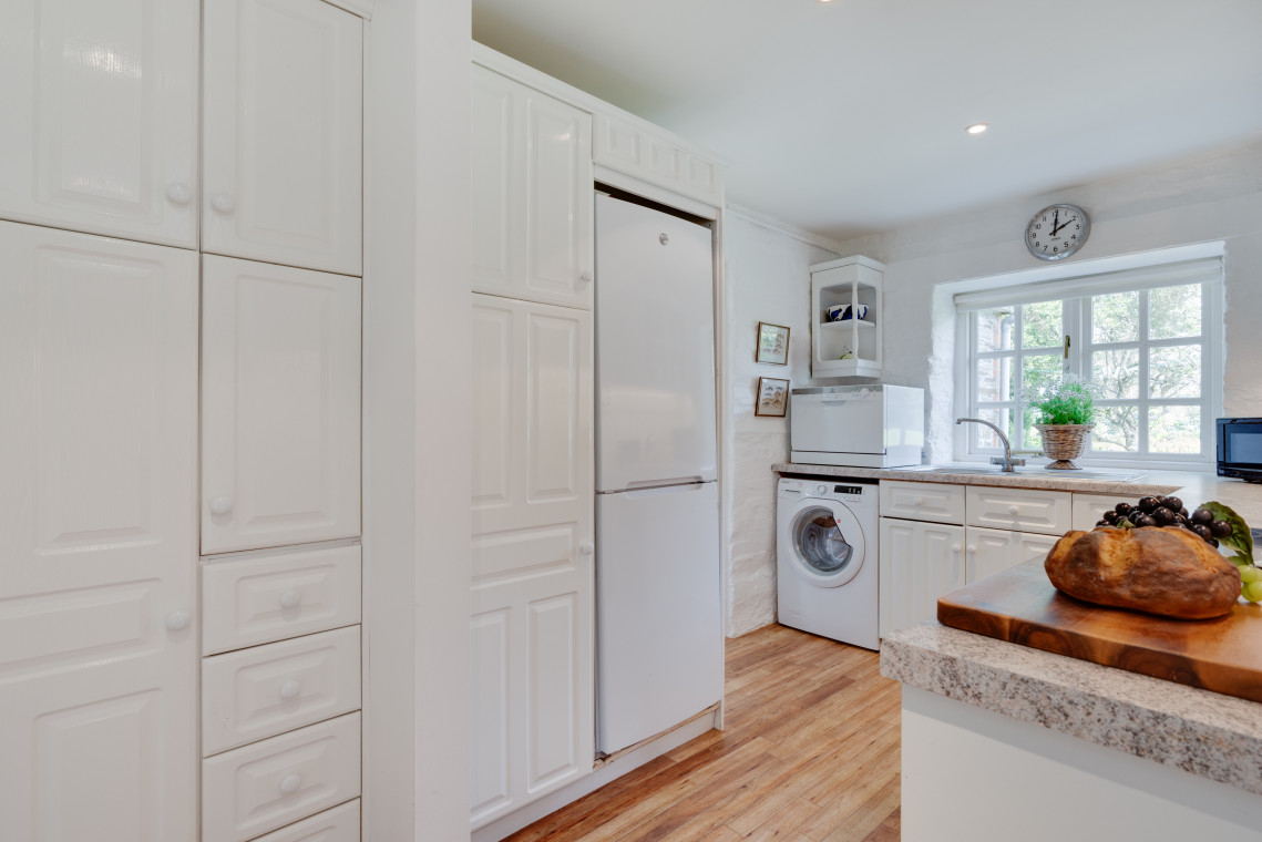 - Kitchen and utilities: Built-in electric oven, ceramic hob, microwave, refrigerator, small freezer, washer/dryer, small worktop dishwasher.