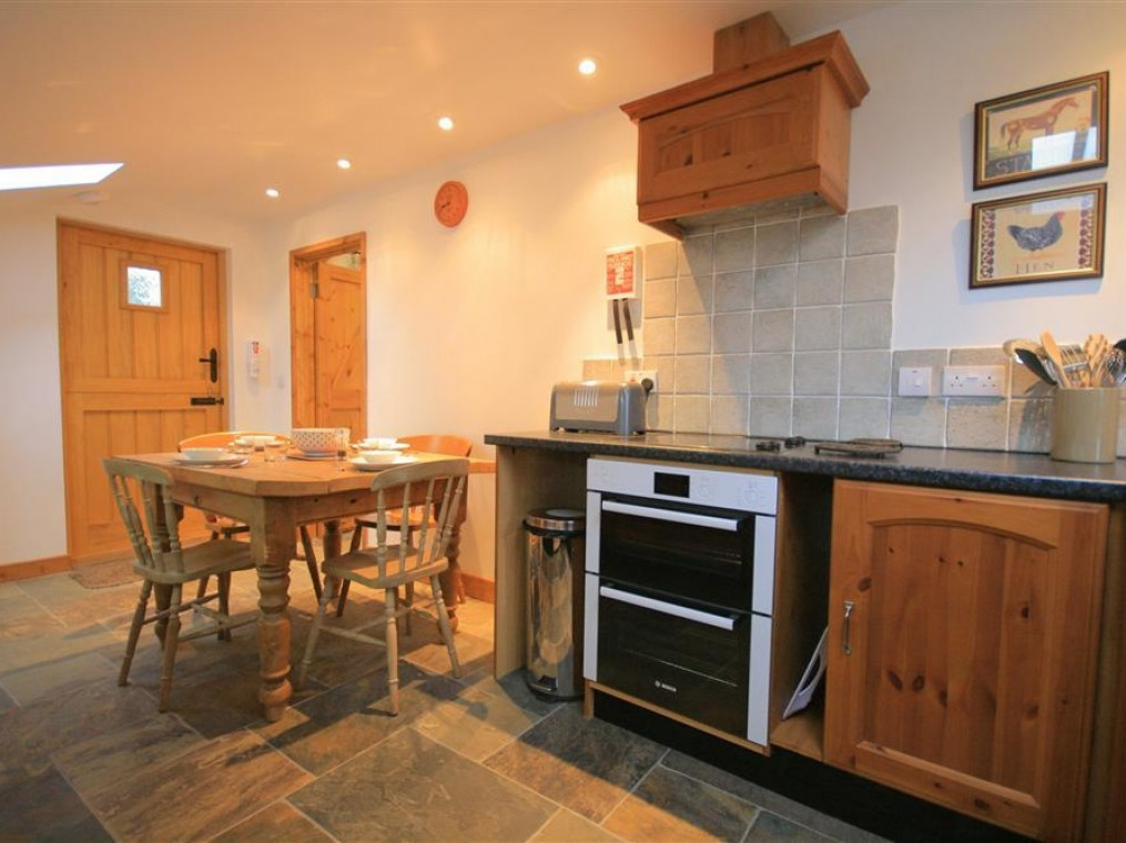 Central heating with underfloor heating and wood burning stove. Electric oven and hob, microwave, fridge, washing machine, dishwasher, TV with Freeview, DVD, WiFi. Fuel, power and starter pack for wood burning stove inc. in rent. Bed linen and towels inc. in rent. Cot and highchair available. Ample off street parking. Terraced area with furniture. Access to fields. Four well-behaved dogs welcome. Sorry, no smoking. Shop and pub 3.5 miles.