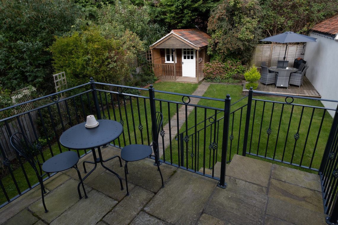 Balcony area with bistro table and chairs, and steps leading down to the garden
