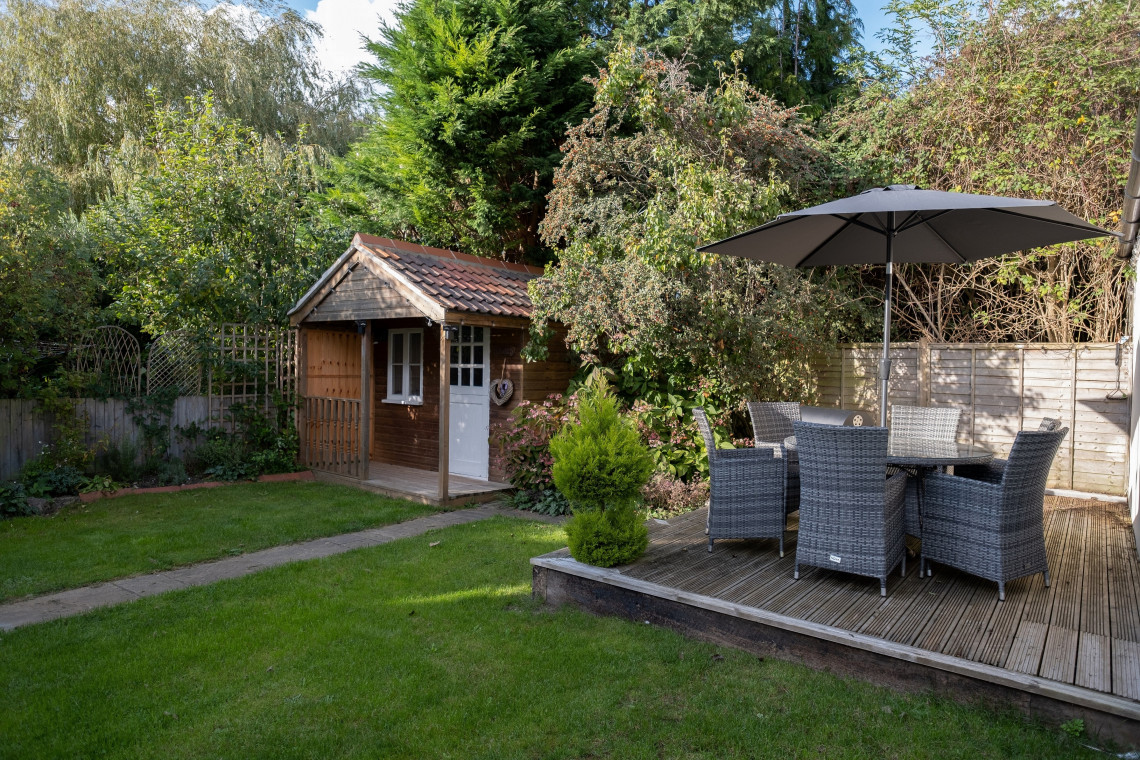 Lawn and decked area with outdoor seating and a charcoal BBQ