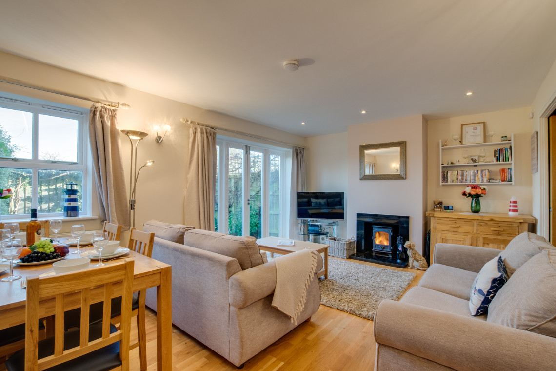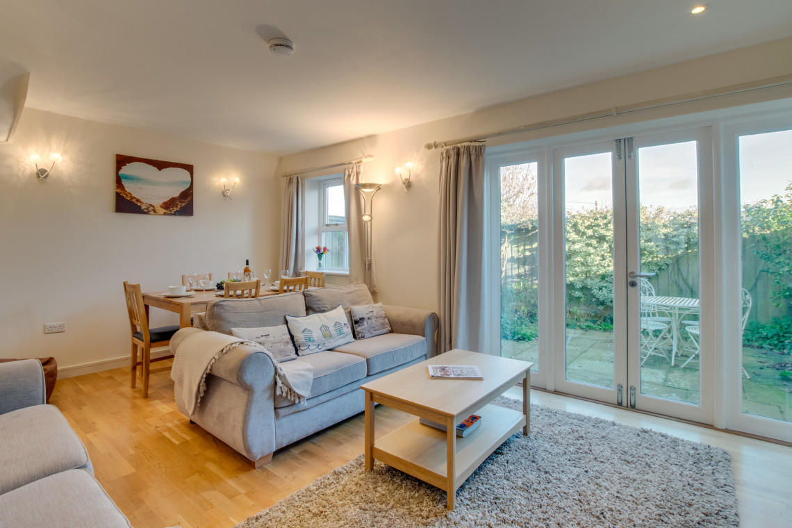 Sitting room, feature fireplace with log burner, dining area, French doors lead to enclosed pretty courtyard with garden table and chairs.