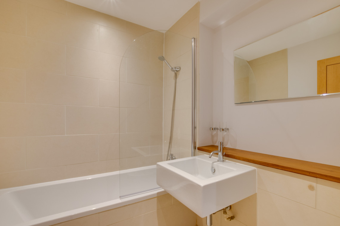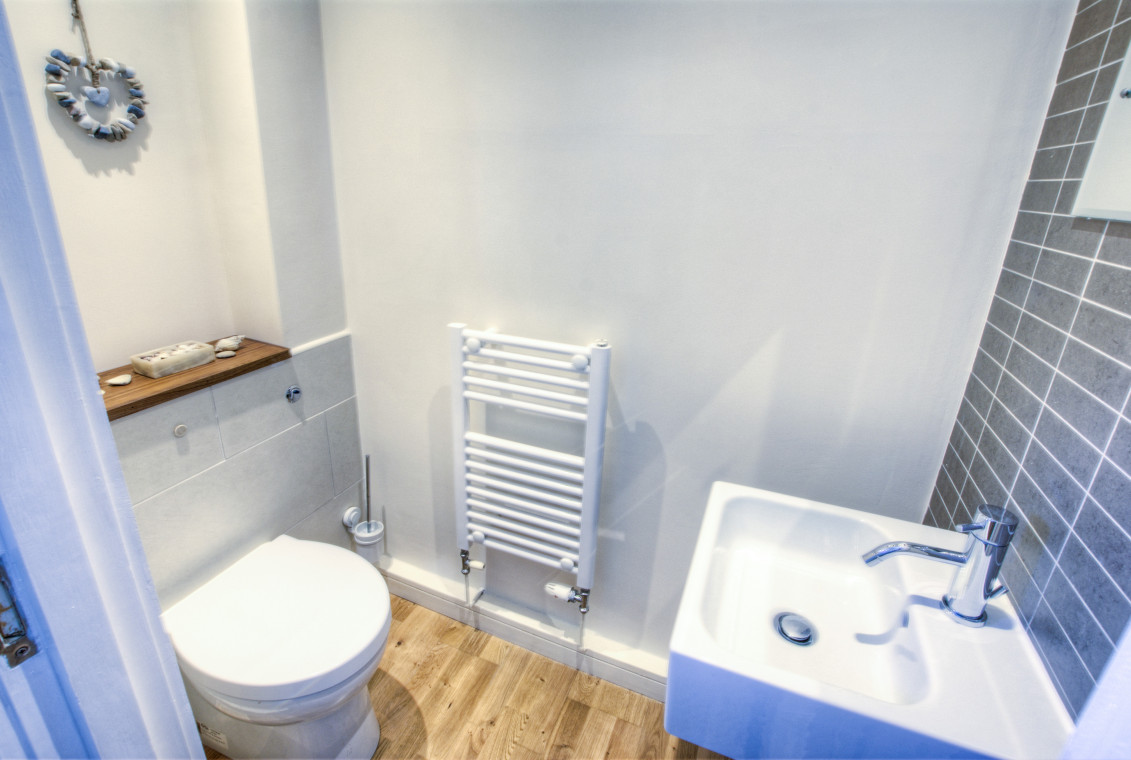 Family Bathroom: Bath, over-bath shower, basin, WC, heated towel rail.