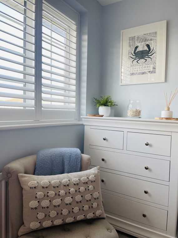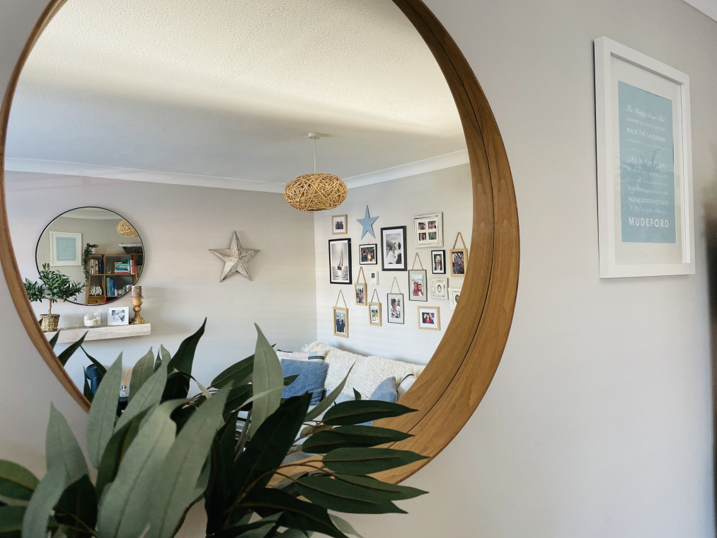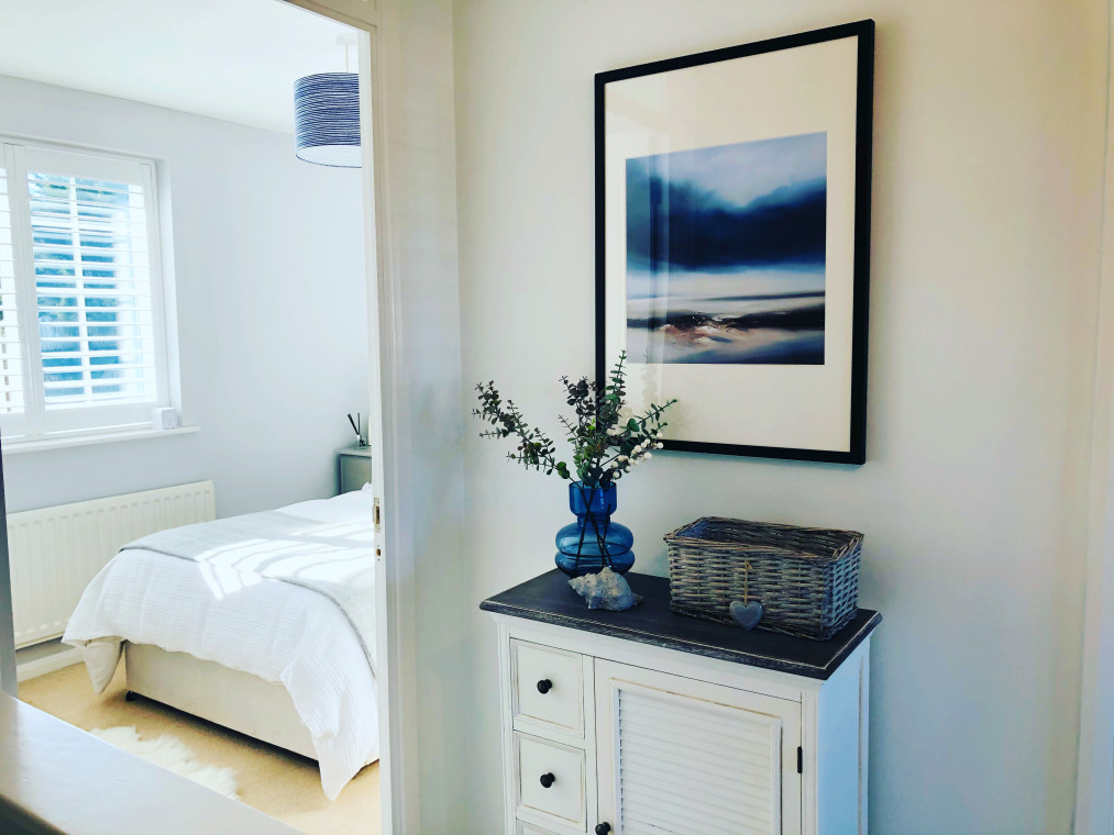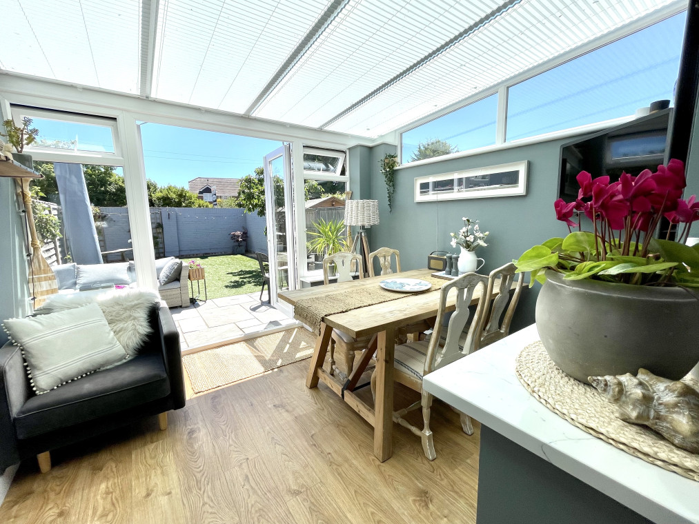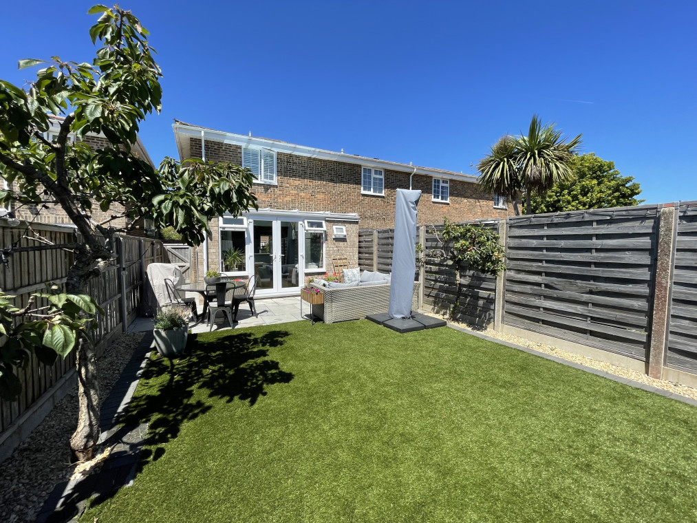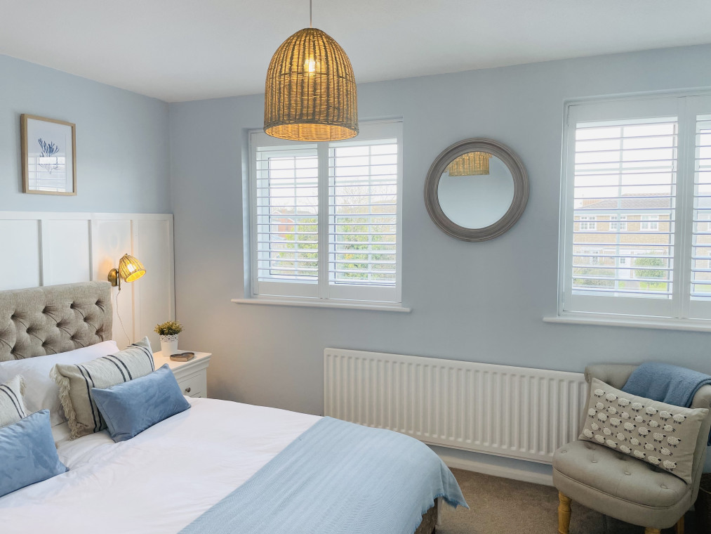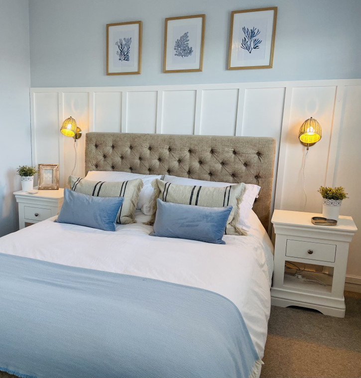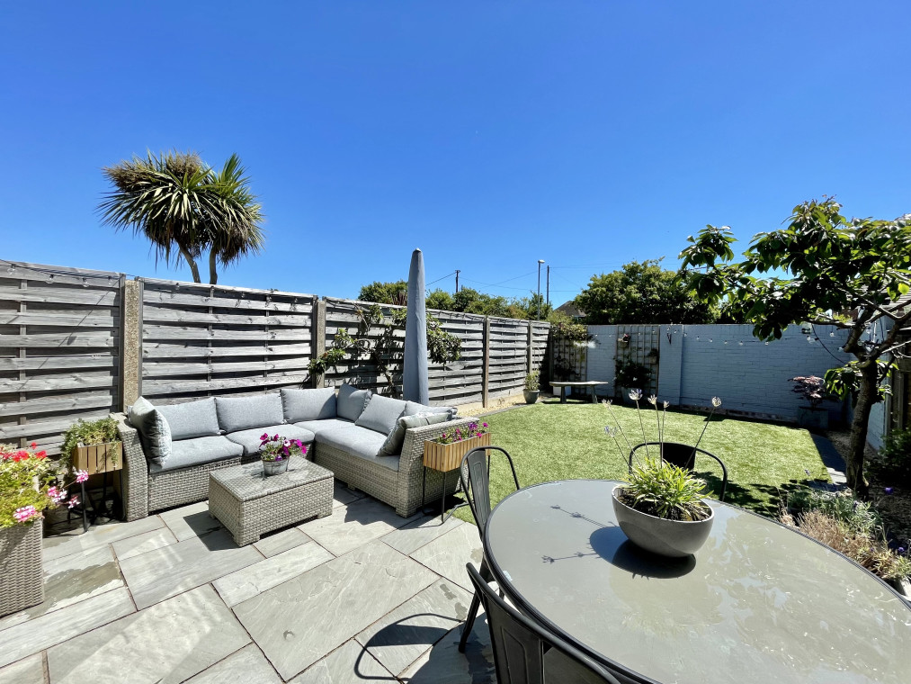 The property is decorated in calming coastal hues and neutral tones with a sunny rear garden with outdoor seating.