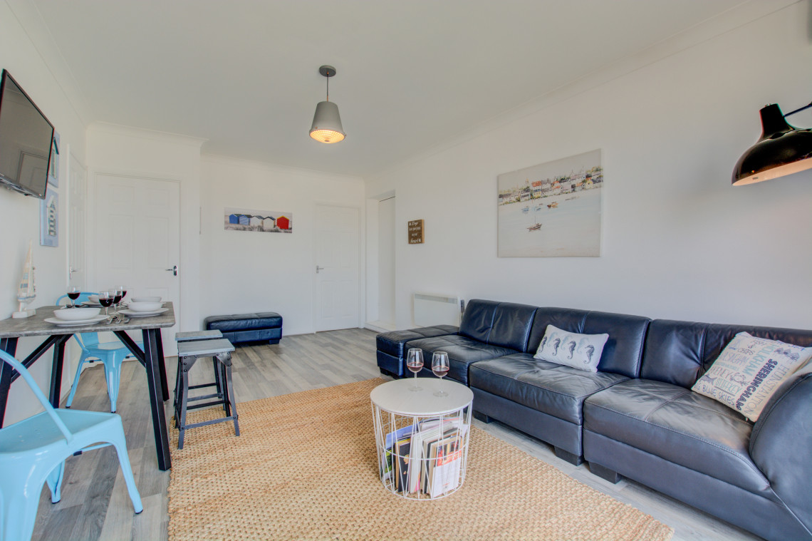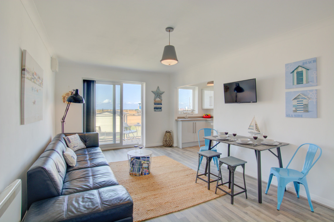 Seashells is a stunning apartment boasting modern and open-plan living with a well-equipped modern kitchen and is finished to a high standard offering a perfect holiday retreat for both smaller families and couples. This first floor apartment is in a great location, slightly set back from the promenade and iconic ski club and café; with distant sea views of the wash.