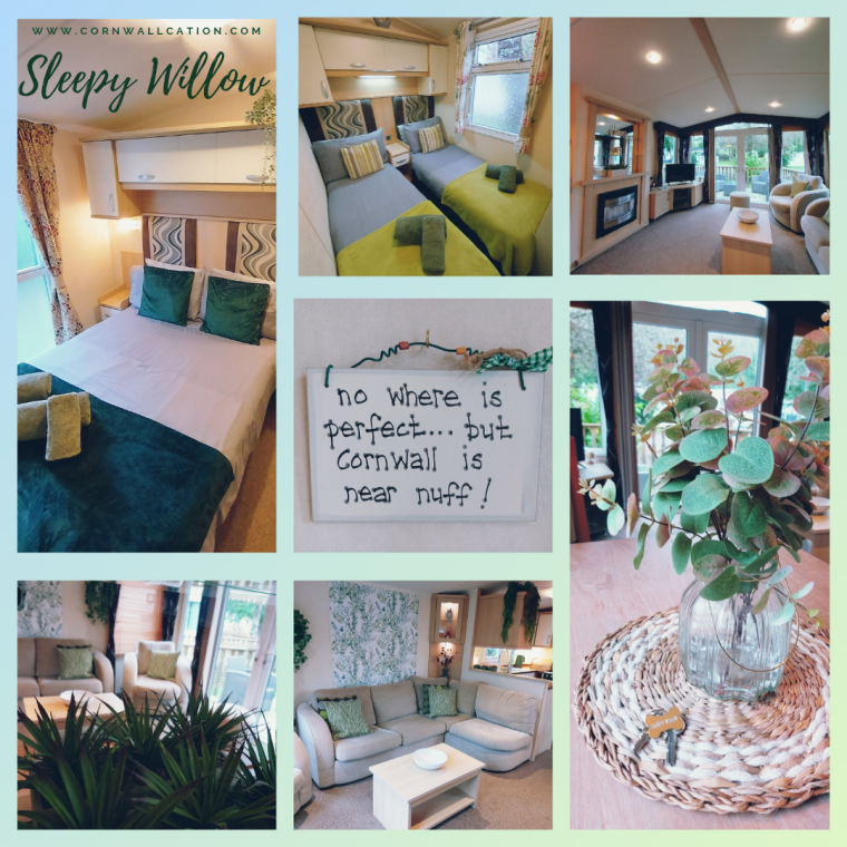 Sleepy Willow A cosy place for 4 guests and up to 2 dogs. Key Features: Free Wifi (avarage 50mbps) Smart TV 32" Linen & towels can be booked Cooker, oven, microwave, toaster, electric kettle, large fridge/freezer Central heating, water and gas are inclusive Off road parking for one car / EV charger on the main car park Outdoor seating area with bbq on fenced wooden deck Well equipped launderette on site Up tp 2 dogs allowed by arrangement The property: Two bedrooms: master bedroom with a double bed and bathroom en suite one bedroom with two single beds (length 6ft) Two bathrooms: one bathroom (with toilet and basin) en suit for the master bedroom one shower bathroom, including toilet and basin Living area: open plan kitchen (well equipped) with dining area spacious living room with gas fireplace and two patio doors which lead to the deck Outdoor area: fenced, wooden deck with outdoor seating area car park for one car in front of the caravan For more details, prices and photos, visit our website www.cornwallcation.com