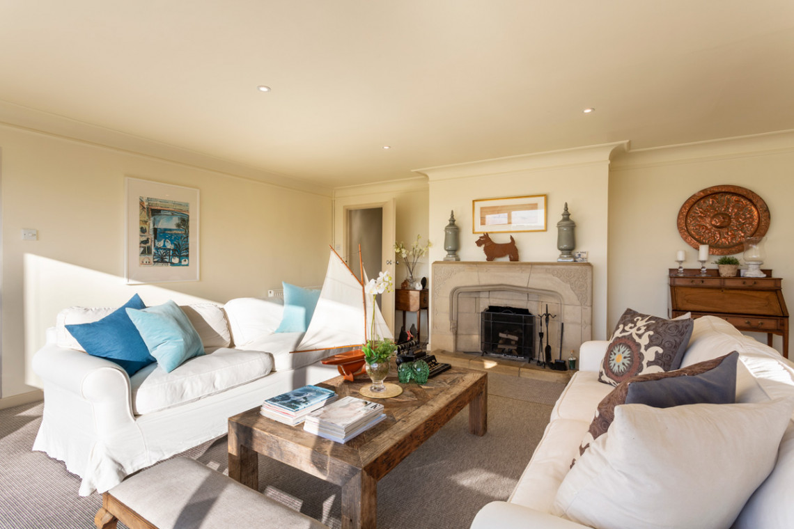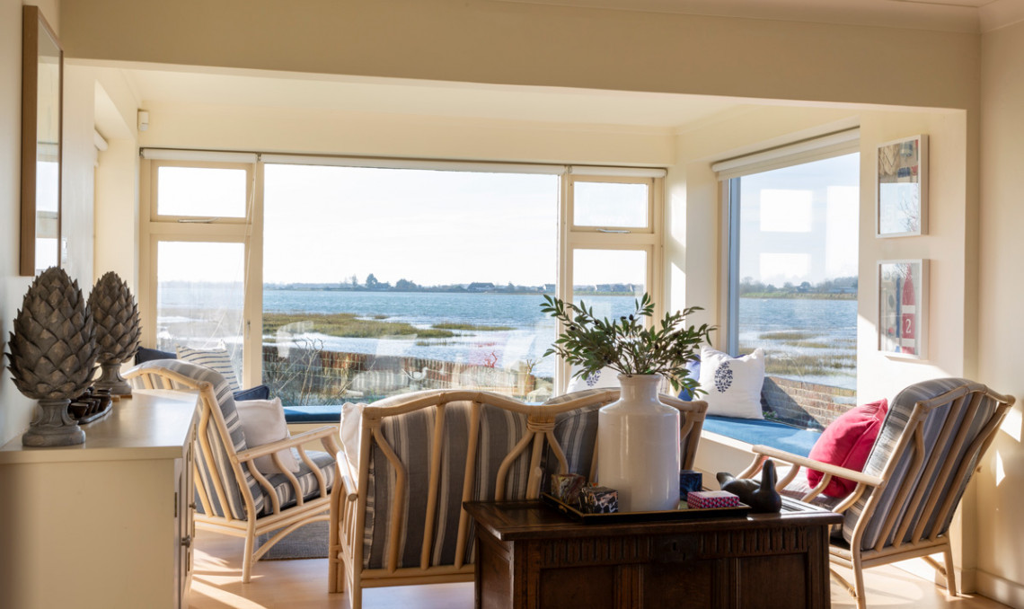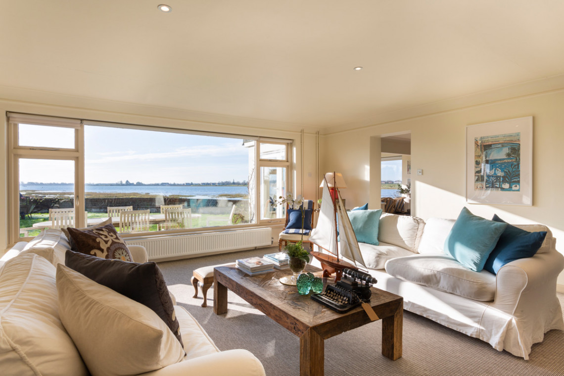 - Living room with cosy fire and waterfront views