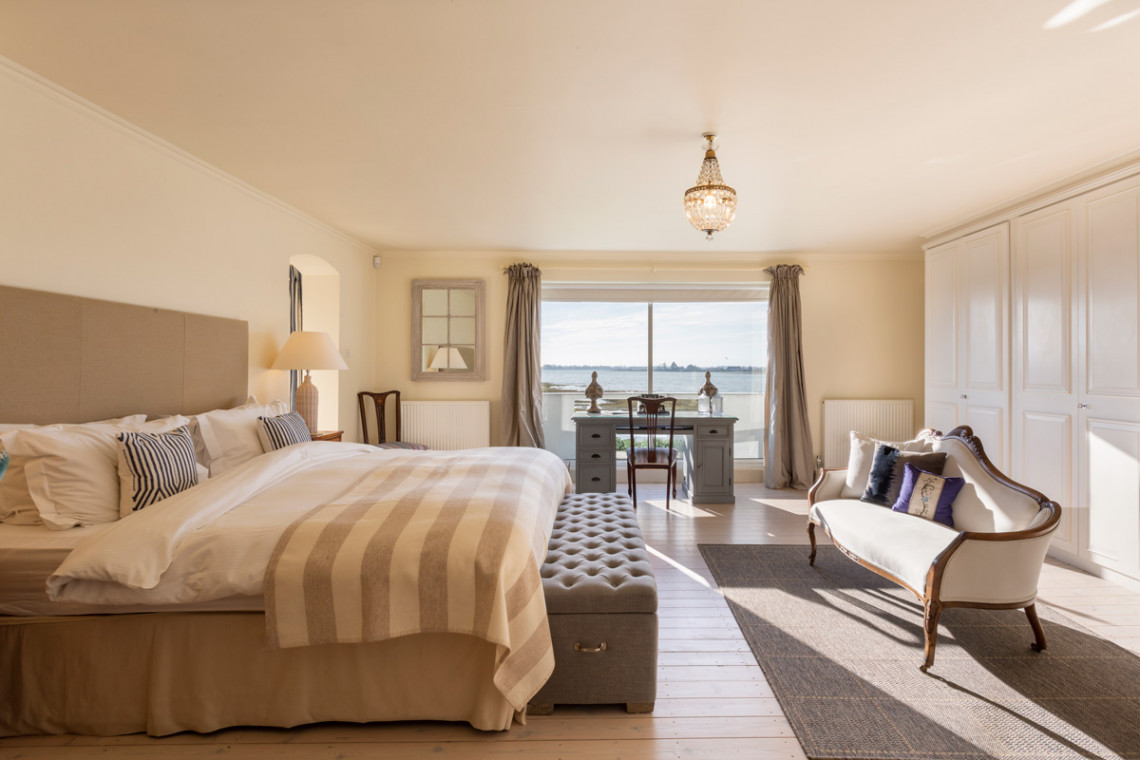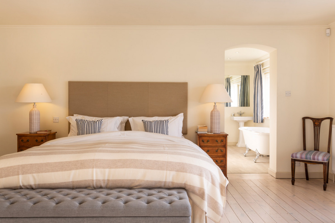 - Master bedroom with super-king bed, private balcony, access to larger shared balcony and en-suite bathroom with roll-top bath and walk-in shower