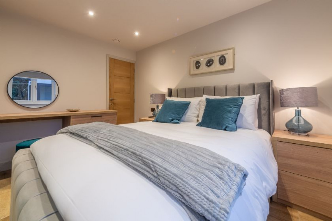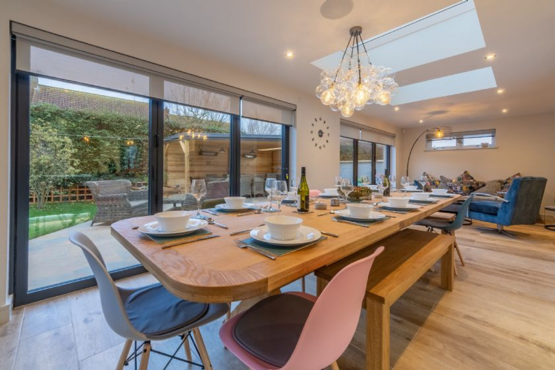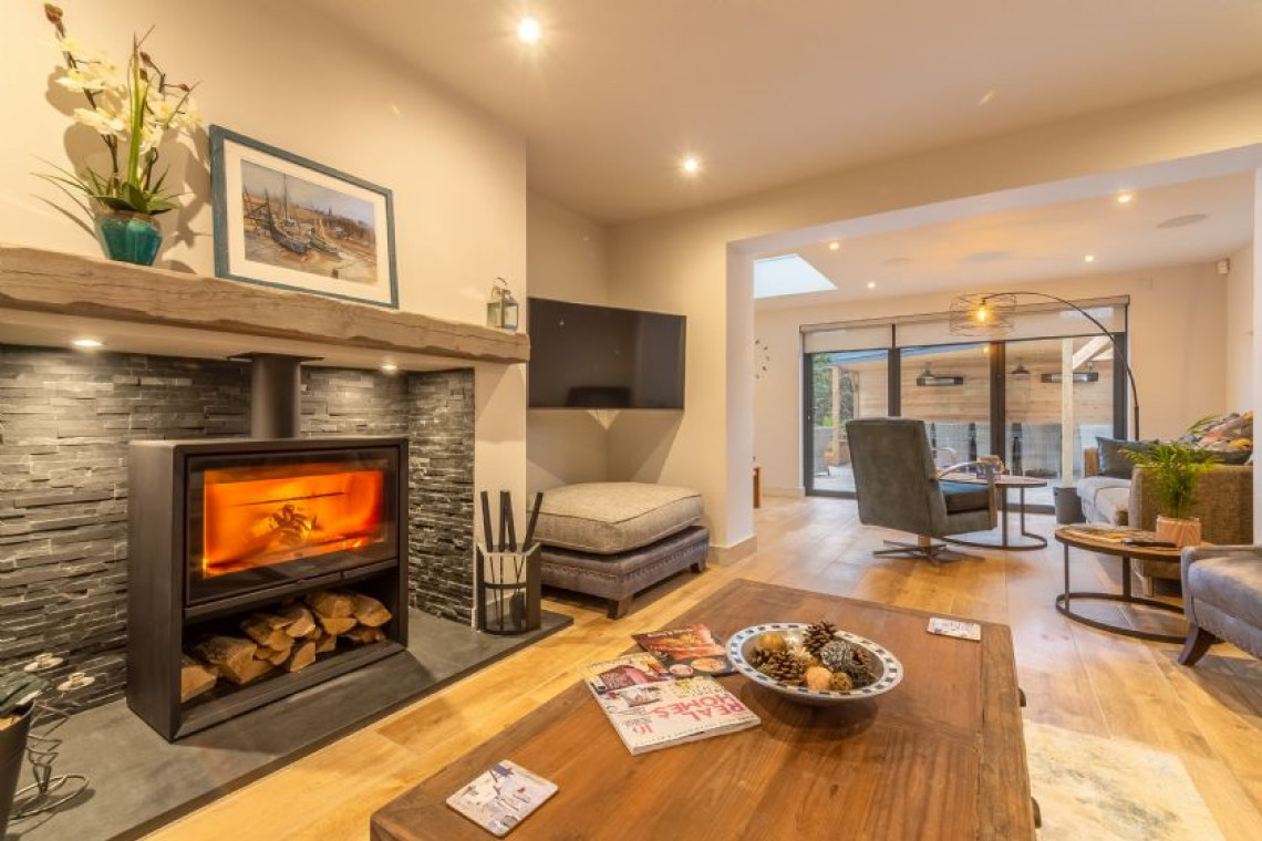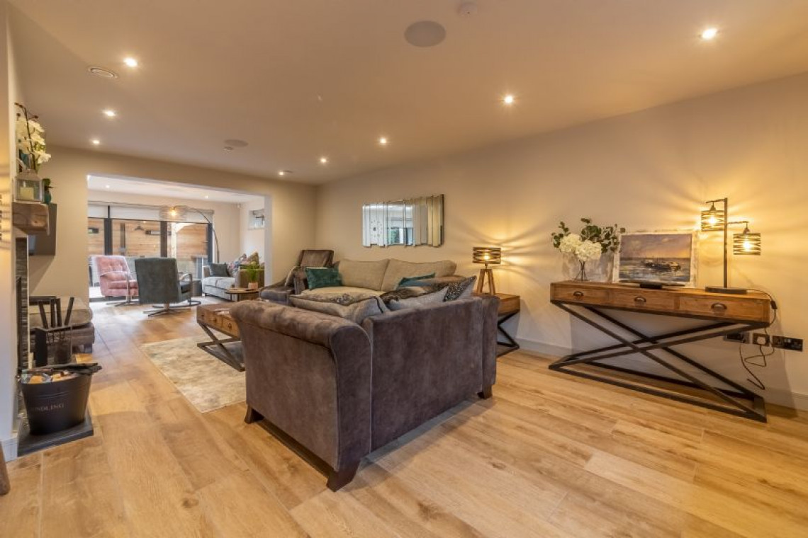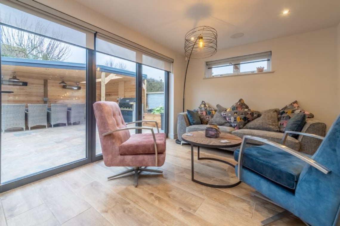 With impressive eco-friendly credentials, complete with underfloor heating and oodles of gadgets to make life oh-so-simple. Boasting open-plan living with a super-stylish kitchen which has every appliance and gadget you could wish for, mod cons have been cleverly integrated throughout. With a large dining area, you will love rustling up breakfast, lunch or supper in this sumptuous house which is perfect for one or two couples or a few friends. Bi-fold doors lead out onto the fully-enclosed terrace and garden. This superb space has been beautifully designed by the owners and the games room and outdoor eating and dining area is an extension of your living space. Perfect for lazy lunches after returning from the beach, or evening sundowners and barbecues, you can snuggle down even on cooler evenings, as this area is both heated and boasts outdoor lighting. Back inside, the large sitting room boasts a stunning feature fireplace with wood burning stove. Downstairs you’ll find two luxury en-suite bedrooms, one of which is mobility friendly.