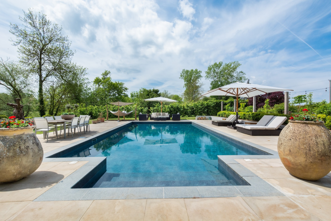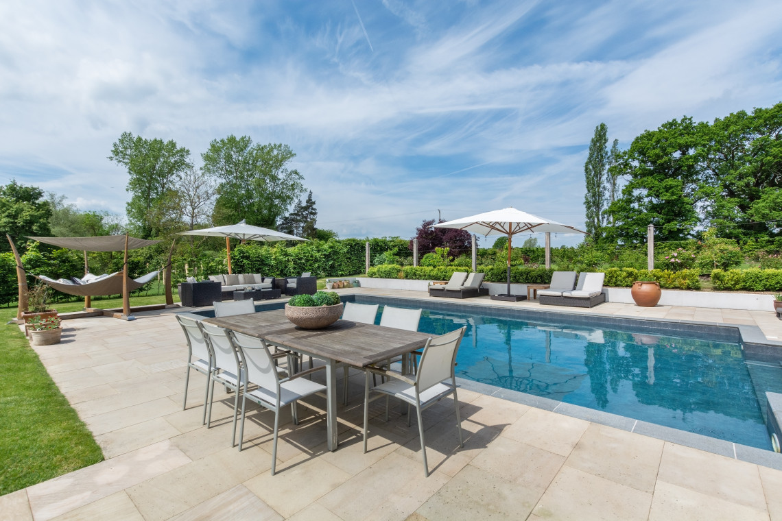 Utilities: electric hob and oven, fridge/freezer, microwave, dishwasher. A washing machine and tumble dryer are available in the pool house.