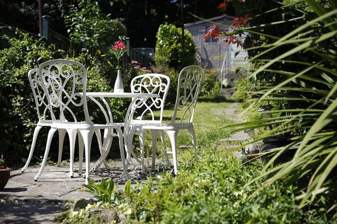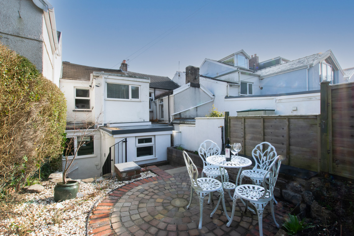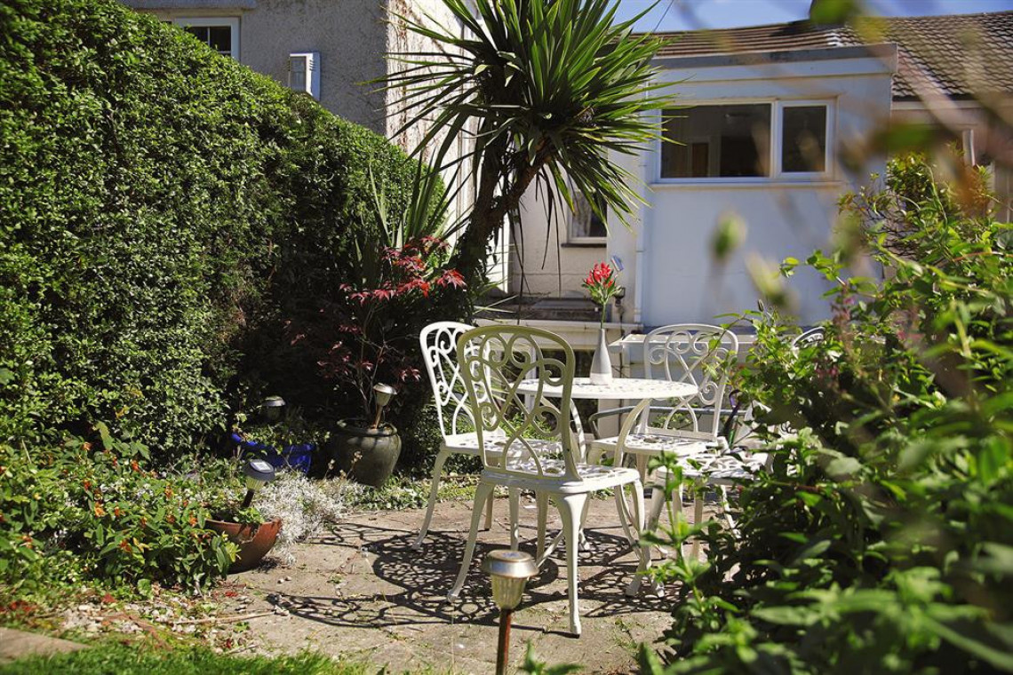 - Outside: rear lawned garden with some planting and outdoor dining furniture for 4.