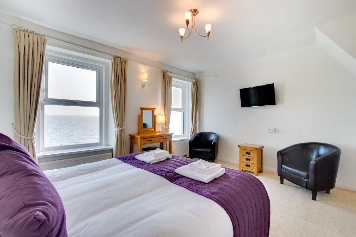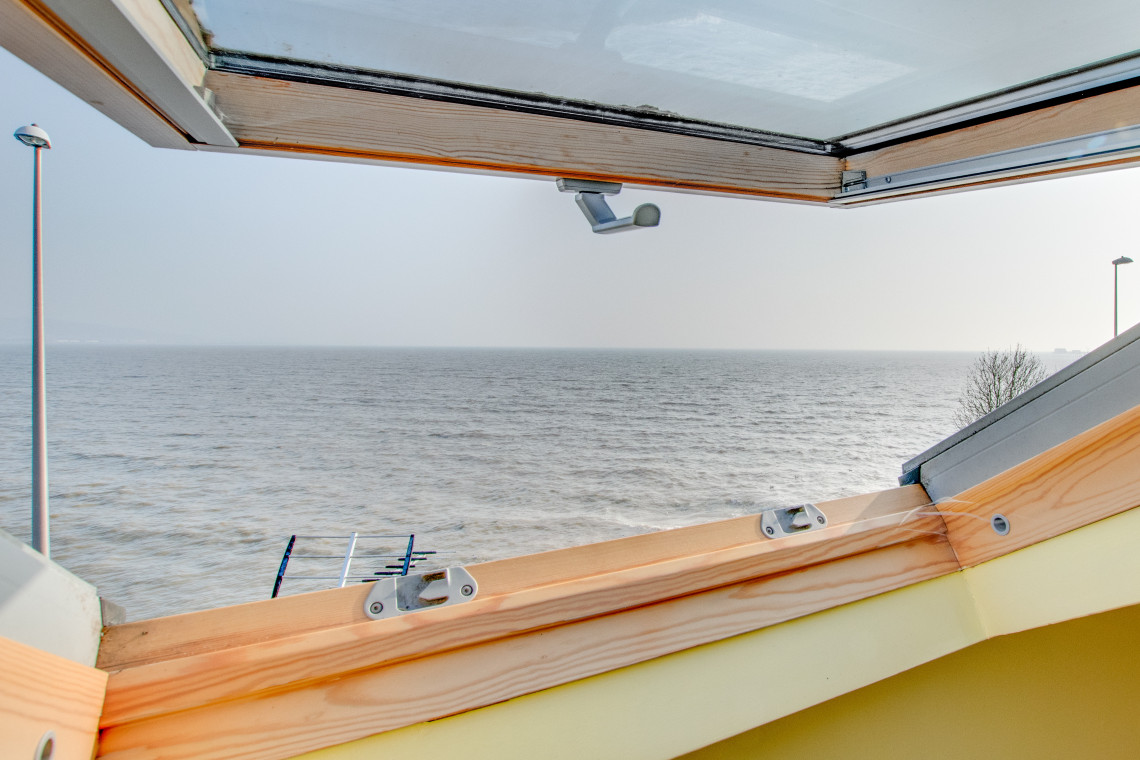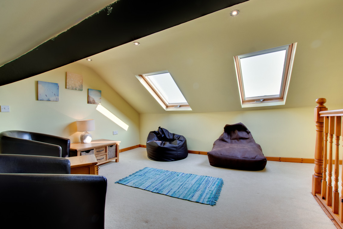 - Second living room: soft seating, Velux windows with seafront views, docking station, books and games.