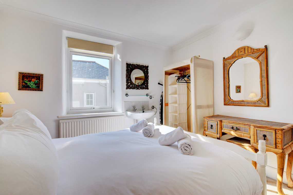 The first bedroom is located on the third floor. It has a double bed with two wooden bedside tables with bedside lamps. There is a washbasin in the corner. There is a flat screen TV, a chest of drawers, a desk and a coffee table next to it. This room access to a balcony with a stunning view of the town and the river Dart.