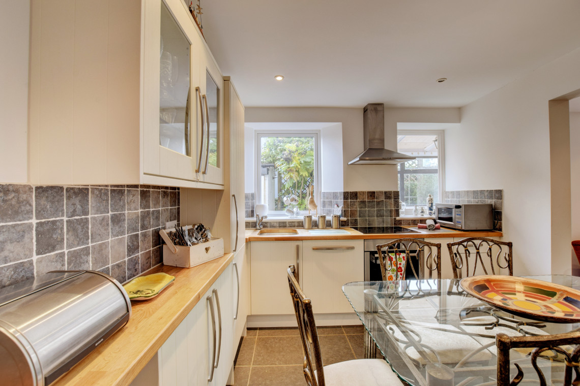 The kitchen is fully equipped with an electric hob and oven, fridge/freezer, dishwasher, microwave and toaster. This room is lit by six downlighters and a window. There is a dining glass table with six chairs.