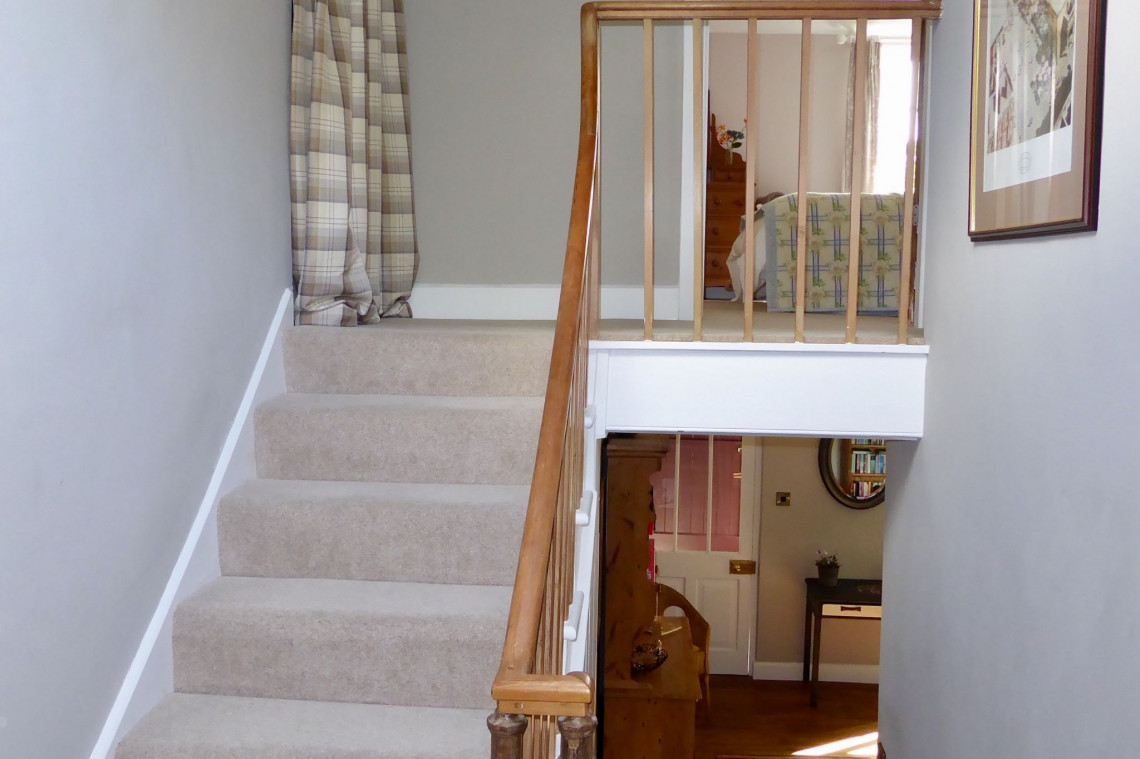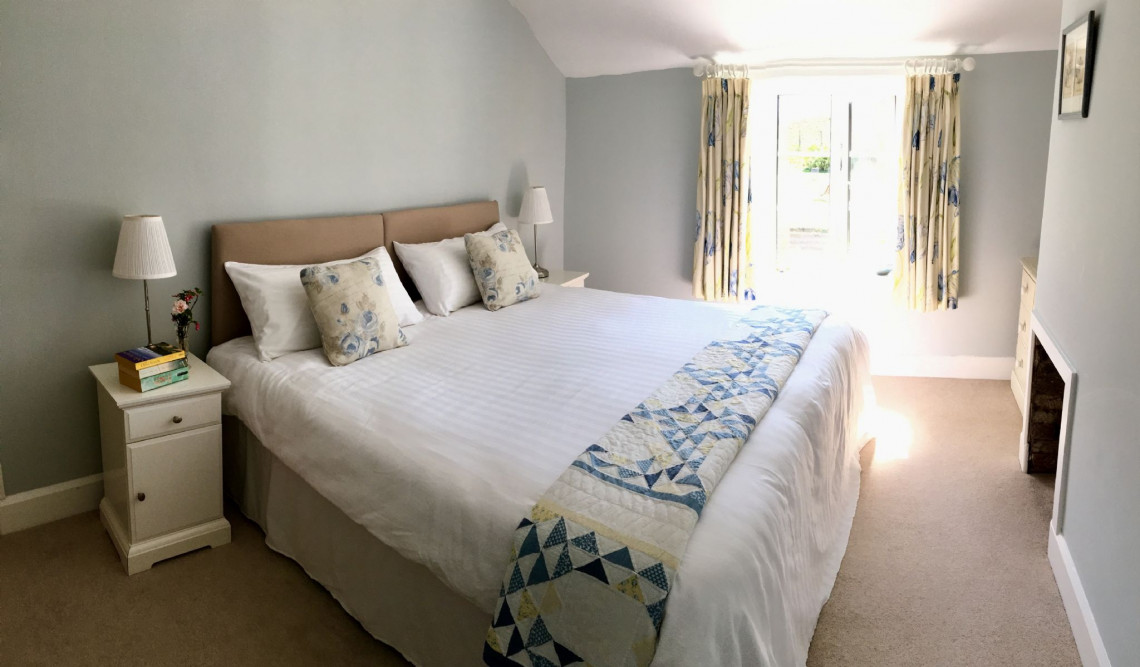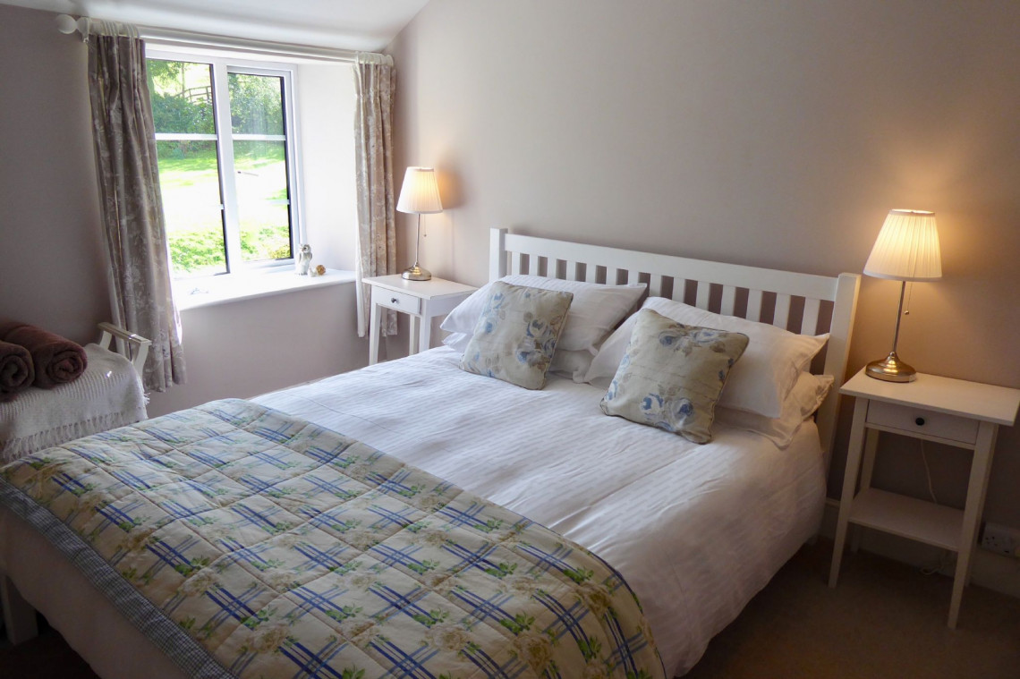 Stairs lead up to the first floor where the bedrooms are; two cosy, comfortable bedrooms with lovely views across the paddocks to the hills beyond. One bedroom has a king-size bed and the other has a super-king bed that can be made up as twin beds on request. Please make this request at the time of booking.