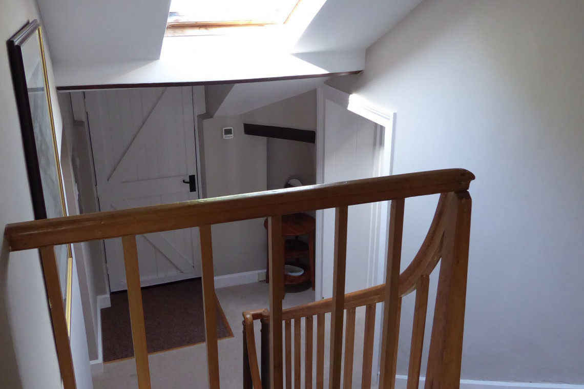 A few steps lead up to a half-landing where you will find the entrance into the bespoke kitchen-breakfast room, with views of the orchard from the old pine table. On the opposite side of the hall is the bathroom, which comprises a power shower over the bath, toilet and hand basin. Both kitchen and bathroom have underfloor heating, and the kitchen has a dishwasher, washing machine and microwave in addition to the ceramic hob and fan assisted oven.