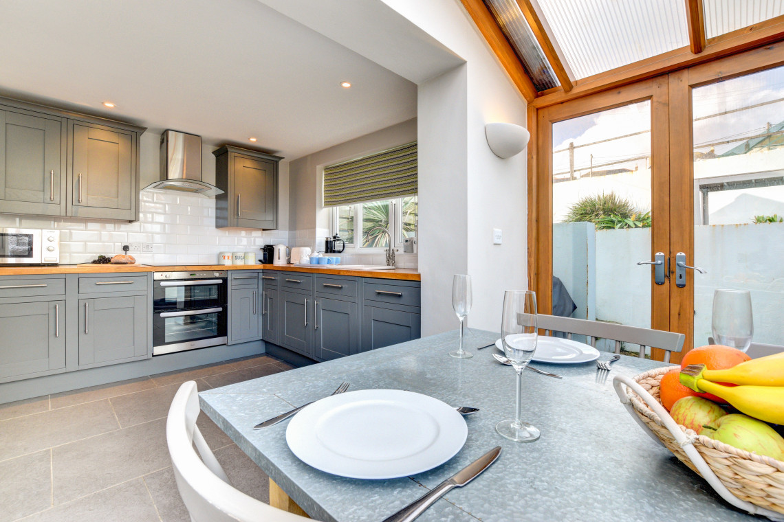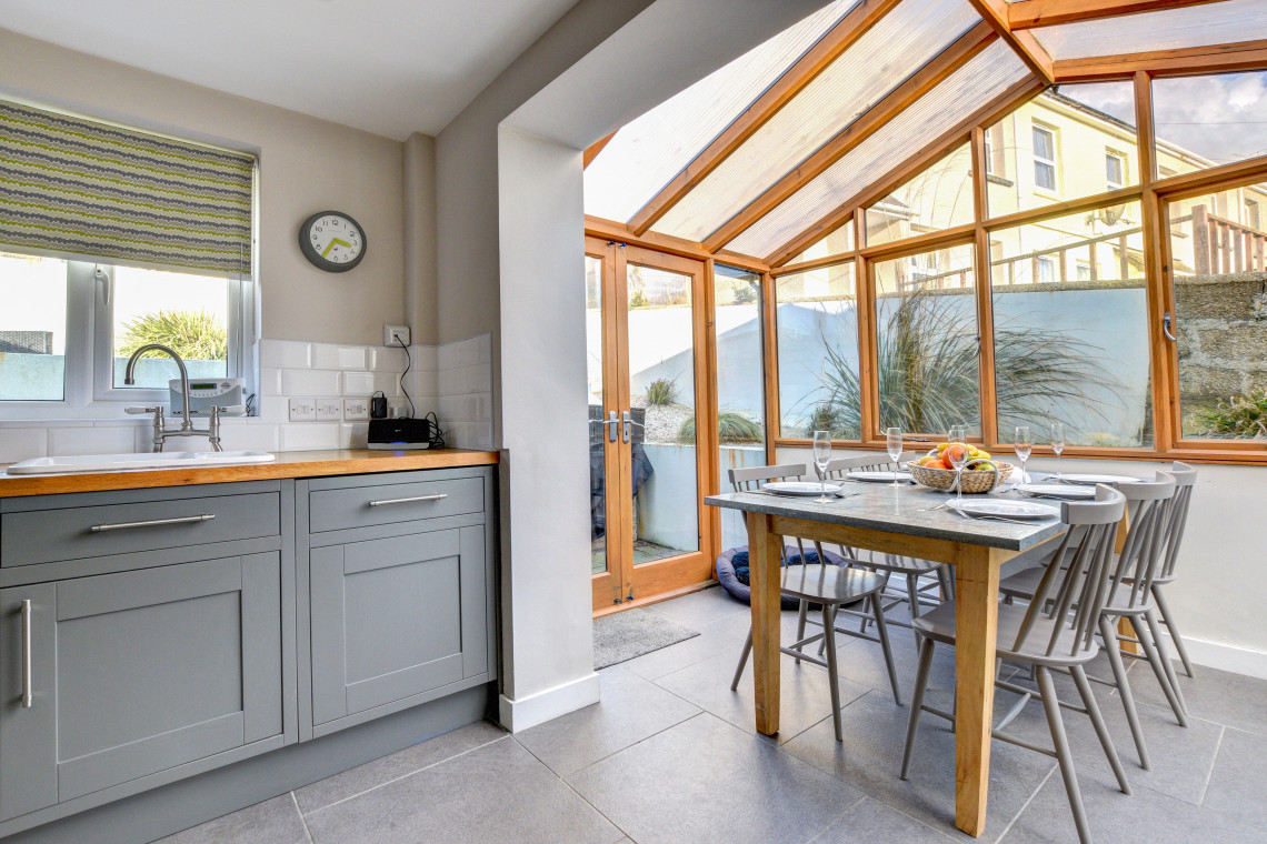Stormgazer has most of its living accommodation on the first floor to make the most of the beautiful sea views and has the added bonus of a completely detached and very private sunroom situated literally above Porthleven beach. Downstairs there are two double bedrooms and a cloakroom whilst upstairs there is a lounge with sea views, well-equipped kitchen/diner which leads out to a garden, master bedroom with a king-sized bed and the bathroom. Completely separate to the cottage, and situated right above the beach, is a beautiful sun room with a glass balcony. Stormgazer also has a private parking space.