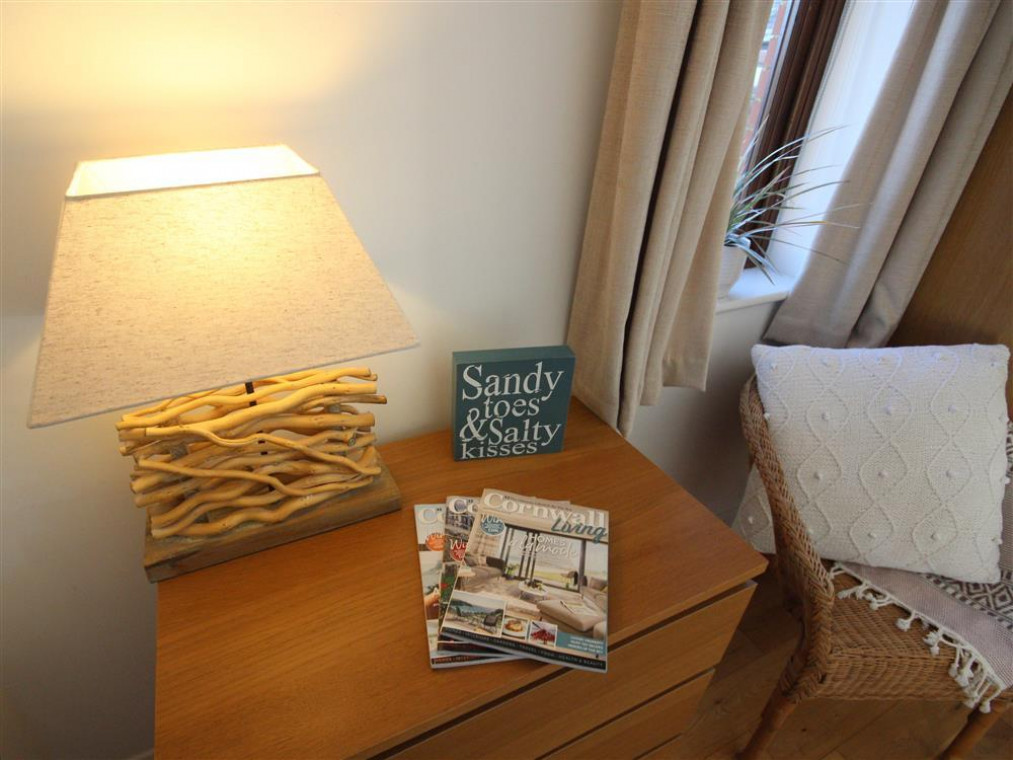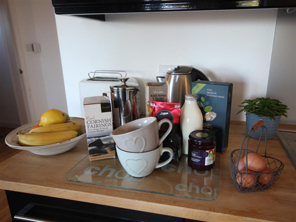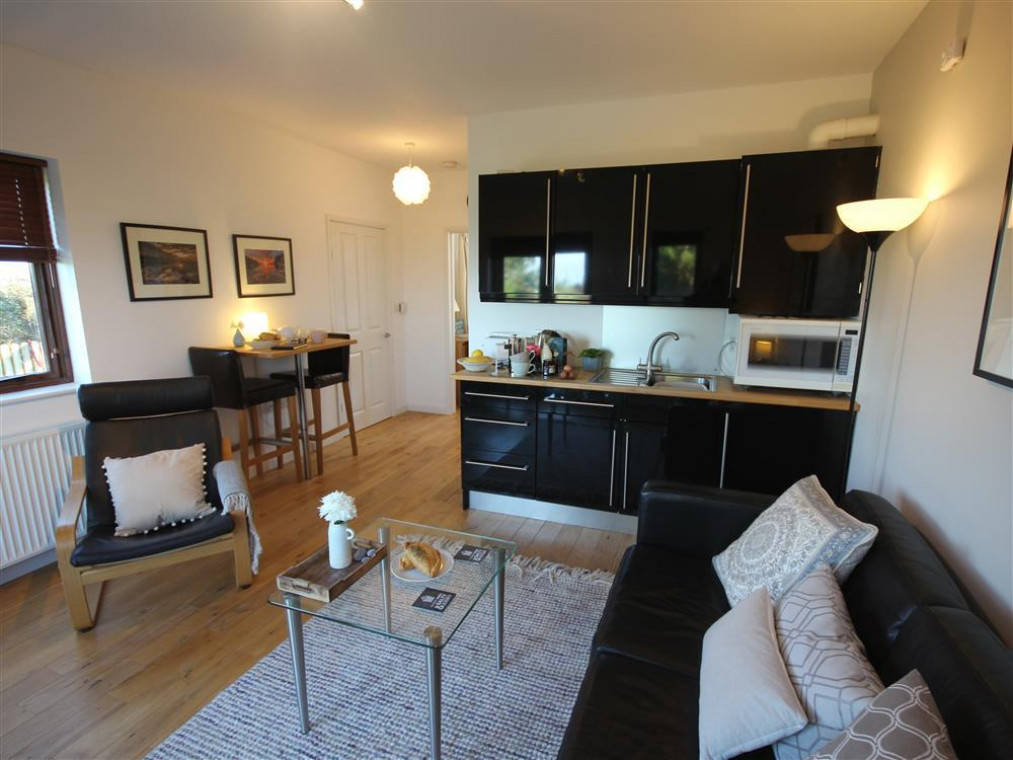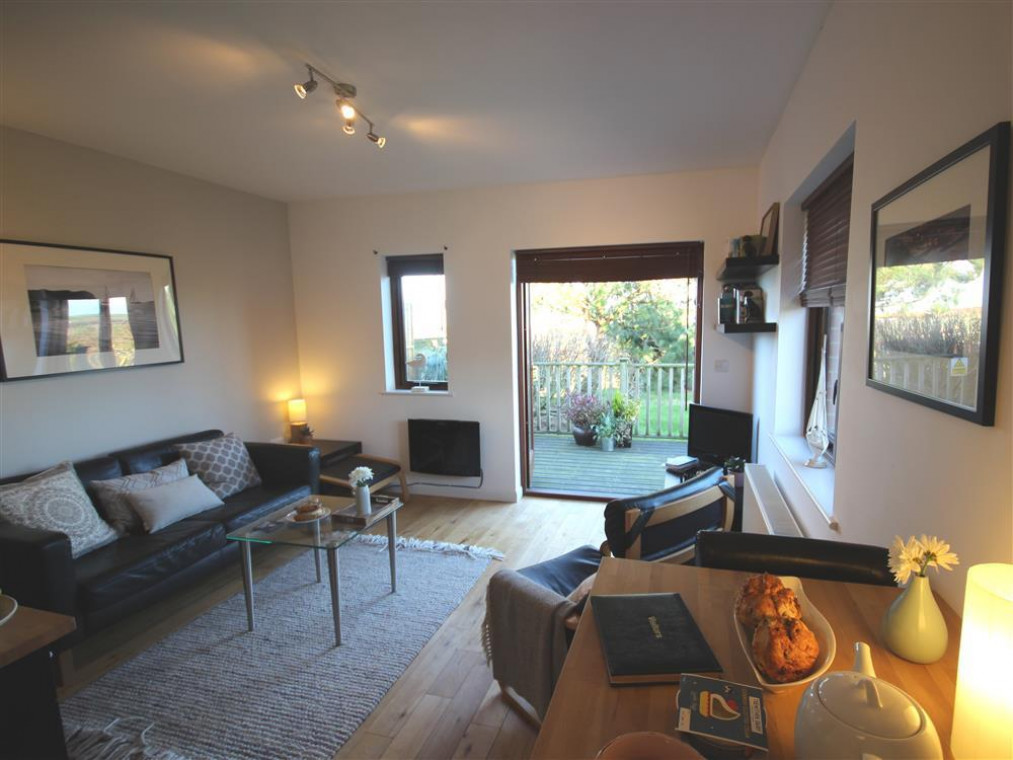 The light and bright, open plan living space incorporates a smart kitchenette with fridge, combination microwave and portable two ring electric hob. There is smart wooden flooring throughout the living and bedroom space and ample comfy easy seating to take in the views. A pair of French doors lead out onto a decked area with seating provided and access out into the fully enclosed garden.