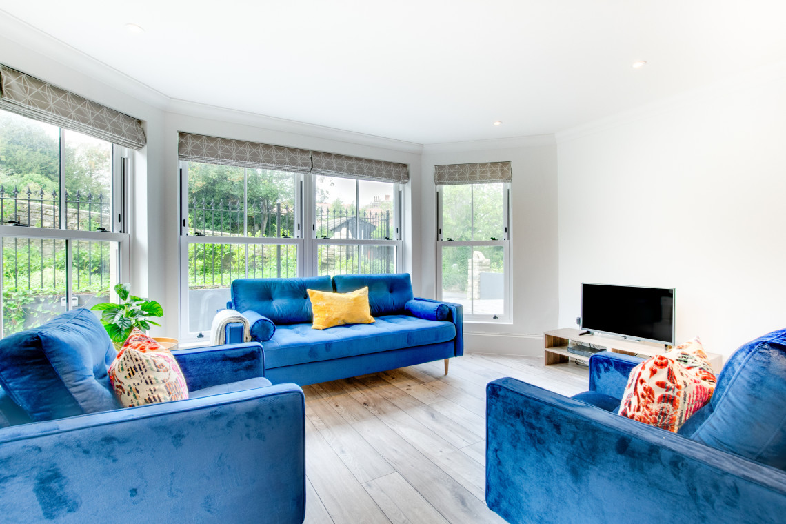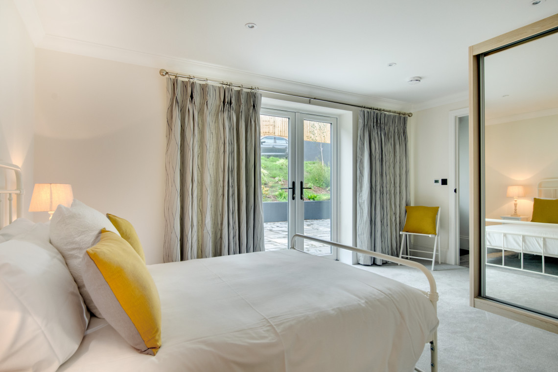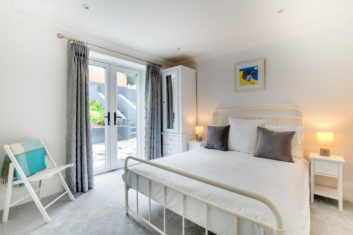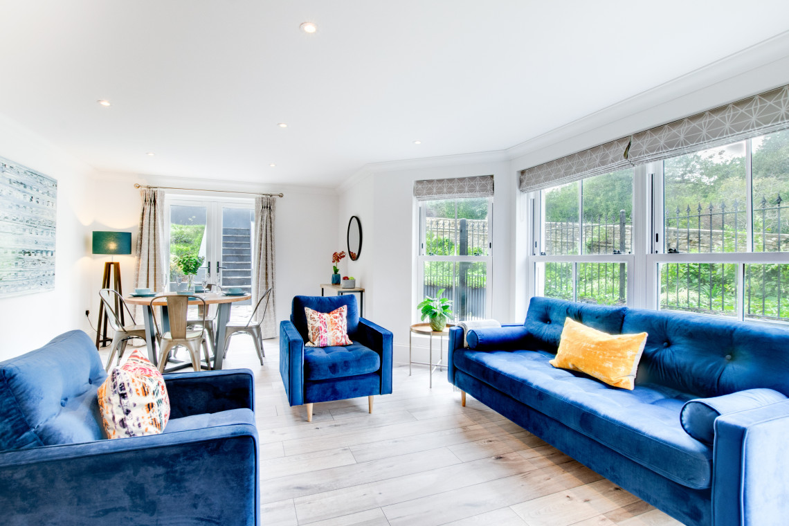 Sunny Place is a modern, newly built two bedroom apartment located within walking distance to Swanage town centre and beach. This ground floor apartment has been finished to a high standard with contemporary and tasteful furnishing throughout. The main living space is 'L' shaped, with a shaker style kitchen and solid wood kitchen island, highlighted by pendant lights hanging from the ceiling above. The kitchen is well equipped and the open plan nature of the room makes it inviting and sociable. The living space is cosy and relaxed with feature bay window and stylish settees, you can even catch glimpses of the sea and beach from the looking out the bay window. Enjoy a meal around the circular dining table, next to patio doors which open out to your own private patio.