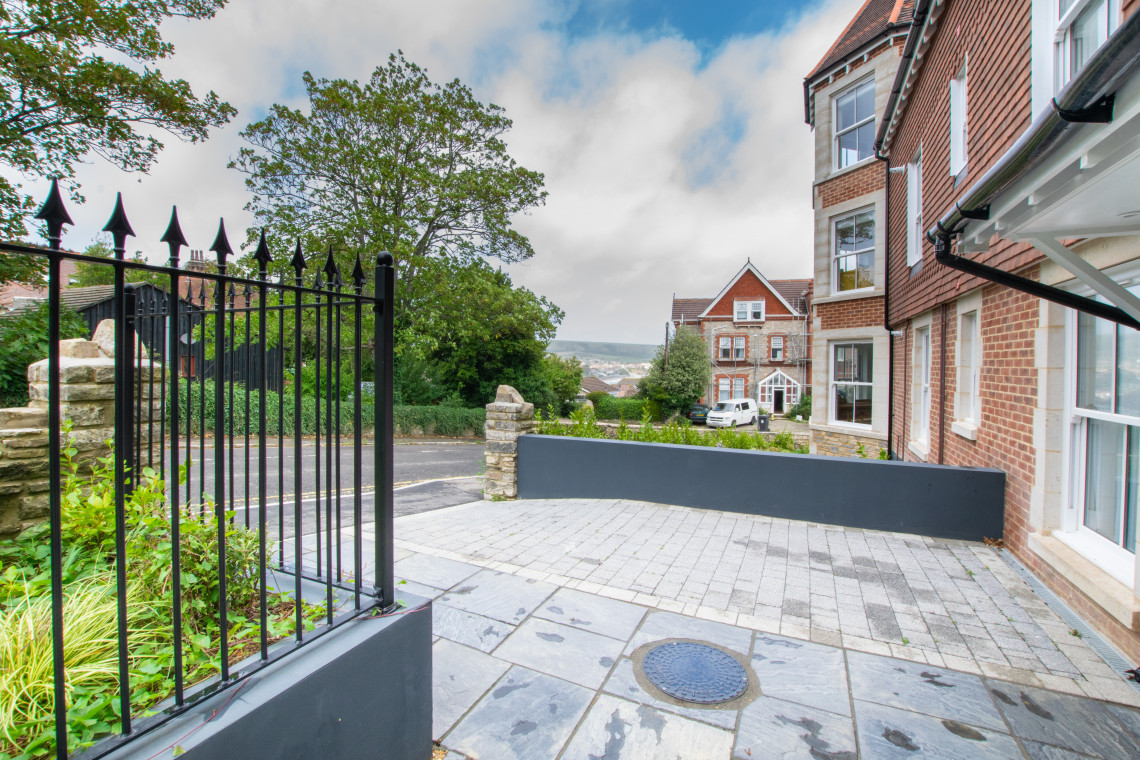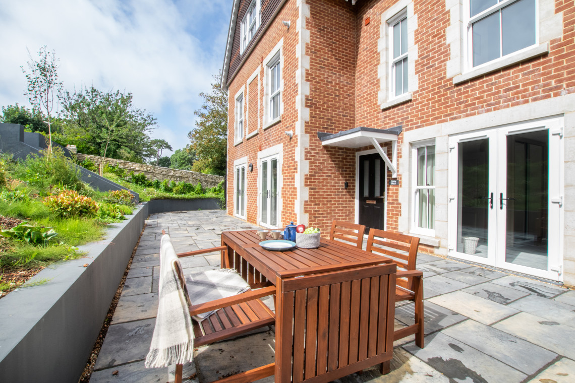 Patio: A paved patio runs all the way along the side of the apartment, with access from the pavement through a private gate or access from the car parking via steps. Outside seating provided