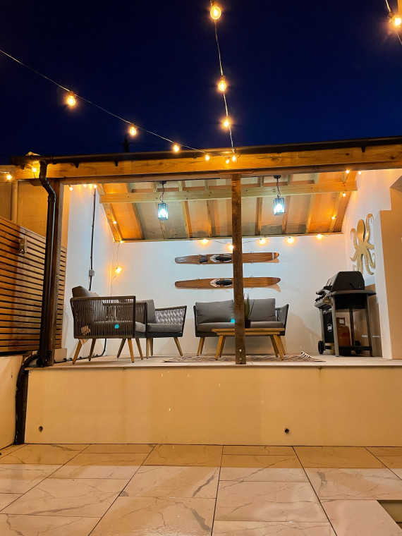 Read MoreThe living room is light and airy with books, games and a TV which is eclipsed by spectacular views of the coast. The brand new modern kitchen at the back of the property has oven, hob, fridge/freezer, coffee machine and well stocked with equipment. There is also a W/C. The back door leads onto a terraced garden accessed by steps with seating, BBQ and outdoor entertainment area with shelter. The first floor has a generous family bathroom and a laundry room with washing machine and tumble dryer. There are 2 double bedrooms and a single bedroom with bunk beds more suitable for children. A small flight of stairs leads to the large master bedroom with en-suite and desk. All 3 front facing bedrooms have stunning views of the beaches, New Quays and Aberaeron coast and if you’re lucky some dolphins! This is a wonderful house for families with easy access to 3 beaches and within walking distance of all amenities. Parking is on the street but there is a car park within walking distance from the house. Small/medium well behaved dogs are welcome.