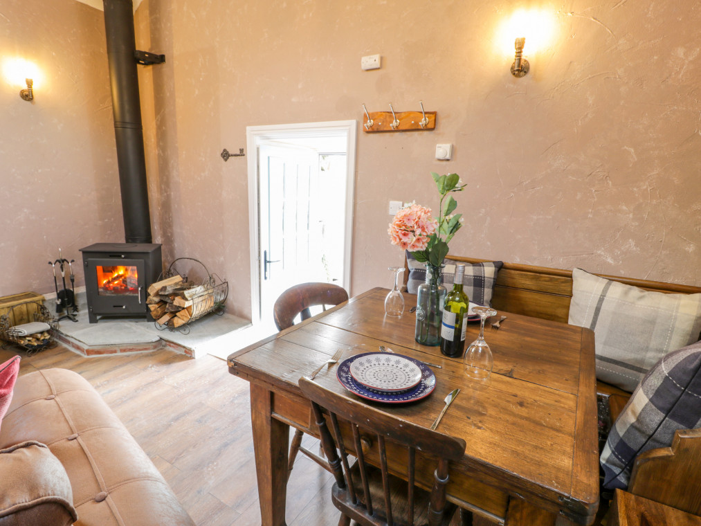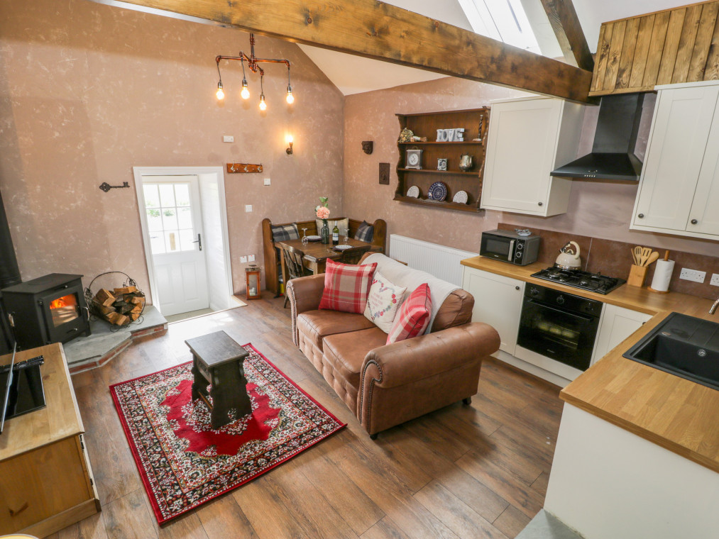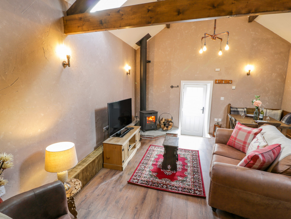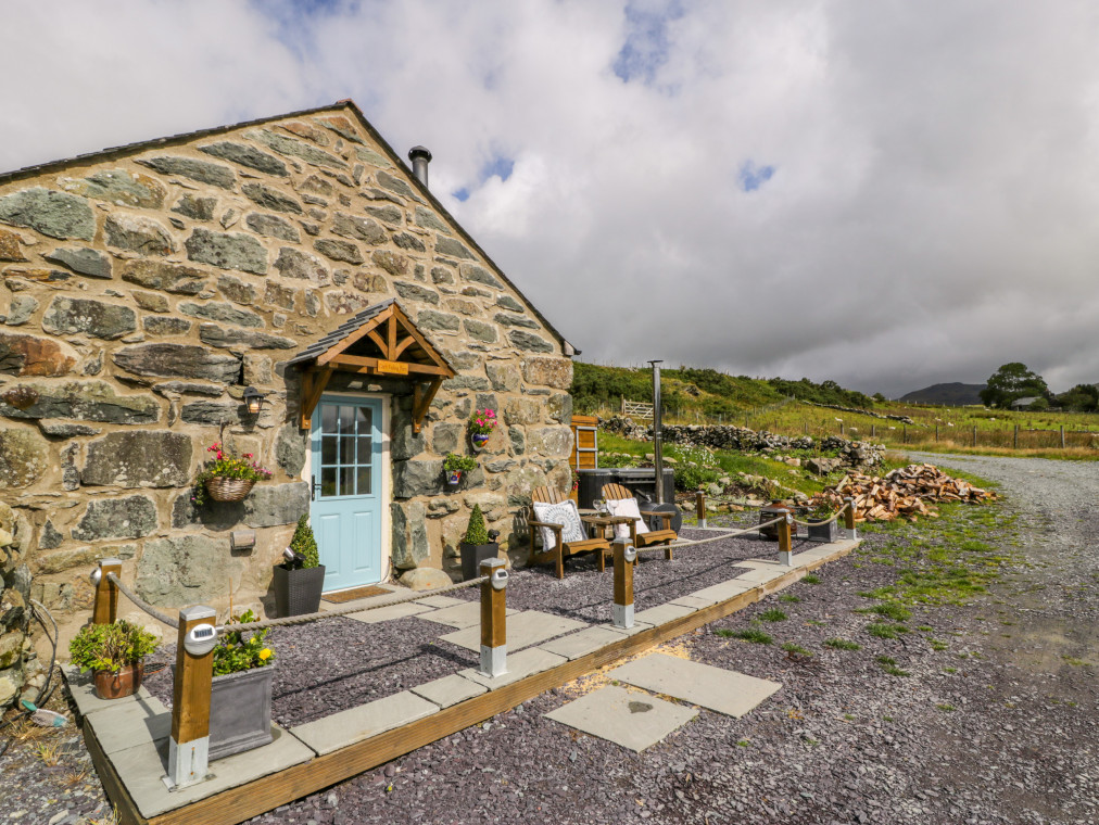 This lovingly converted barn is engulfed by panoramic views of unspoilt countryside, and wonderful sea views stretching over towards the mountains of Snowdonia. It offers a wonderful addition to the farmhouse at Cae'r Fadog Isaf, the perfect, romantic bolthole for a couple seeking some quality time together. Cwn Pennant is one of the most stunning valleys in Wales, with access to all the delights of Porthmadog, Cricceith and Portmeirion nearby. It oozes character from the A-framed ceiling and exposed beams, with a warm and cosy atmosphere. The interior offers a well-appointed, open-plan living room with a woodburning stove adding extra warmth to a wintry evening. There is also a double bedroom up a couple of steps, served by a modern bathroom and outside you have the benefit of a wood-fired hot tub within your own private garden. Take some quiet time with your favourite book on a balmy afternoon, or gather with friends for alfresco dining on a warm summer's evening. Soak in the wood-fired hot tub after a day of adventure and look up at the star-filled sky, taking in the peaceful atmosphere surrounding you. If you fancy heading out for the evening, the nearest pub, the Goat Inn, offers delicious food and drink, down in the village of Garndolbenmaen. nearby, Porthmadog boasts quaint little beach shops and places to eat, as well as the Ffestiniog Railway. Discover the castle at Criccieth and some superb sandy beaches, or explore the Italianate village of Portmeirion. You also have the Snowdonia National Park on the doorstep, with walks, cycling opportunities and many outdoor activities available. Enjoy a memorable holiday in a splendid location. Note: Property can be booked with Ref. 975393, together they can sleep eight guests. All ground floor. One bedroom: 1 x double. Bathroom with bath, shower over, basin and WC. Open-plan living room with kitchen, dining area and sitting area with woodburning stove. Amenities for Rental Gas central heating with woodburning stove Gas hob with electric oven, microwave, fridge, TV, WiFi Fuel, power and starter pack for fire/stove inc. in rent Bed linen and towels inc. in rent Ample off-road parking Private garden area with furniture and wood fired hot tub with all wood provided Two well-behaved dogs welcome Sorry, no smoking Shop 6 miles, pub 4.9 miles Note: There is limited WiFi due to the location of the property Note: Hot Tub dependant on weather conditions.