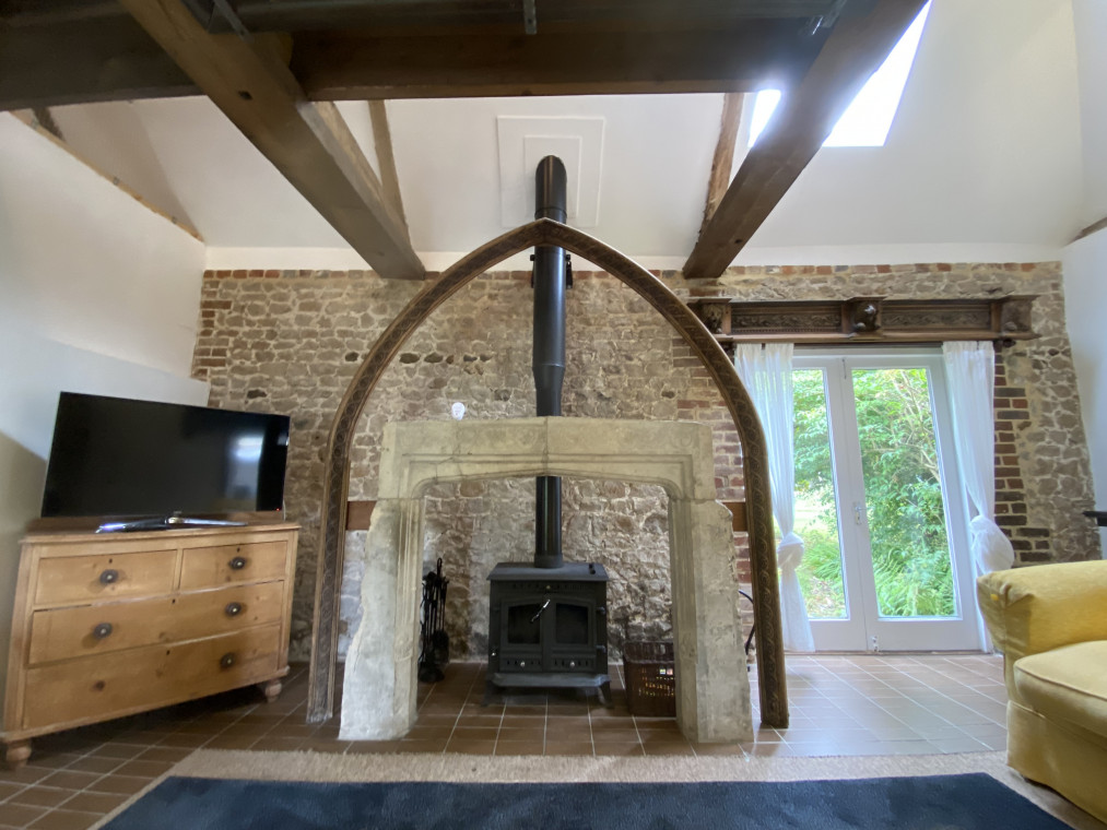 This converted Coach House has a wealth of exposed oak beams and features like the suspended stained glass window, stone fire place with wood burner and decorative wooden arch all adding to the charm and character of this historic building. It has it's own parking area, south west facing garden with access to the private dog walking area of approximately 5 square acres, see photo's.