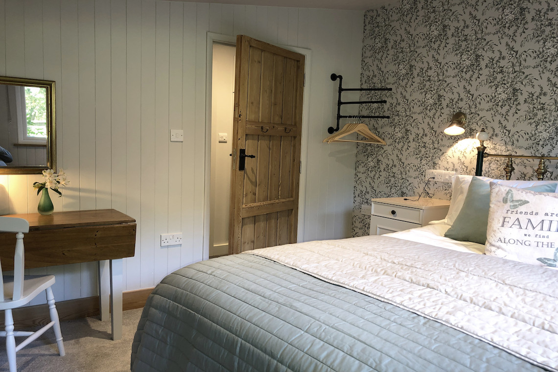 The bedroom provides a relaxing calm sanctuary and offers a king size bed with crisp Egyptian cotton linen, a dressing table. and useful bedside tables including a hair dryer. Storage for clothes, shoes and luggage are catered for within a full height wardrobe area. Please note, we operate a ‘paws on floors’ policy within the bedroom environment.