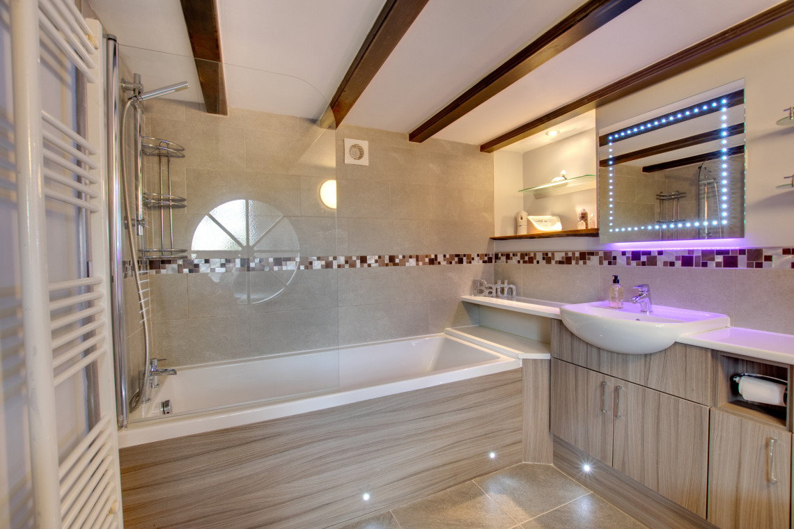 Bathroom: Bath with overhead shower, WC and sink and underfloor heating.