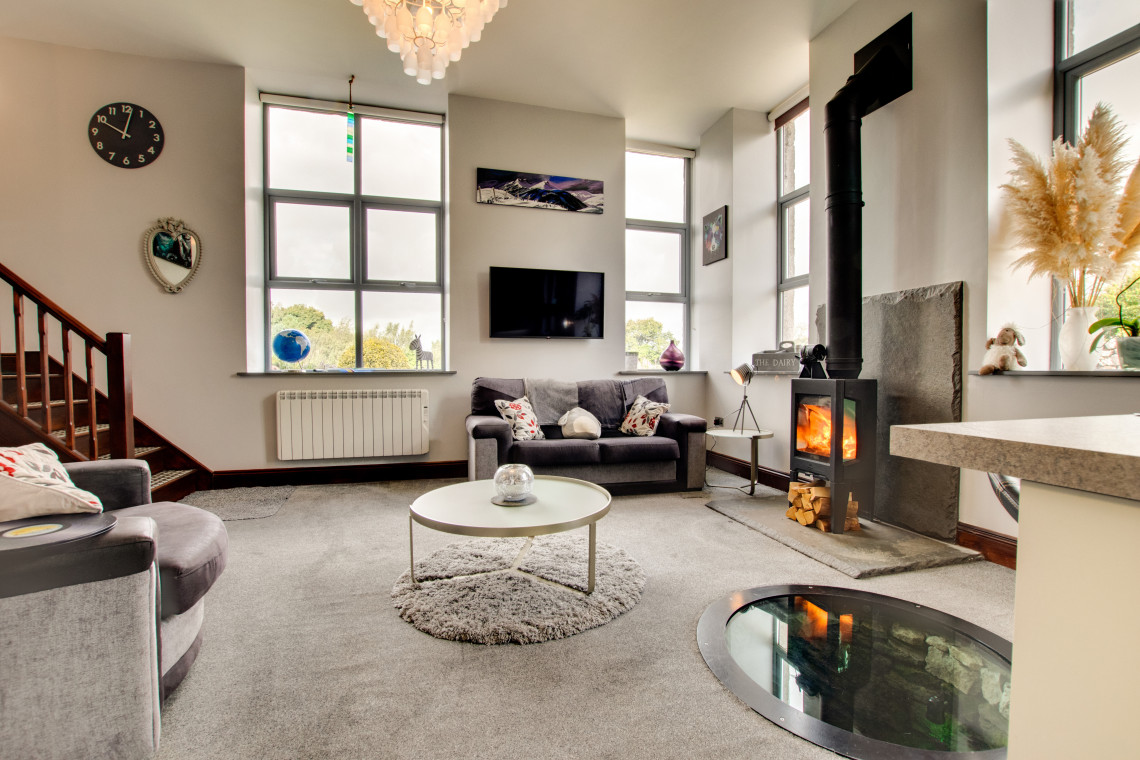 Downstairs there is comfortable seating around a fantastic wood burning stove. The Dairy even still has an old well (covered in safety glass) lit up in the centre of the living room floor, it's a marvellous feature and adds to the unique character of this cottage.