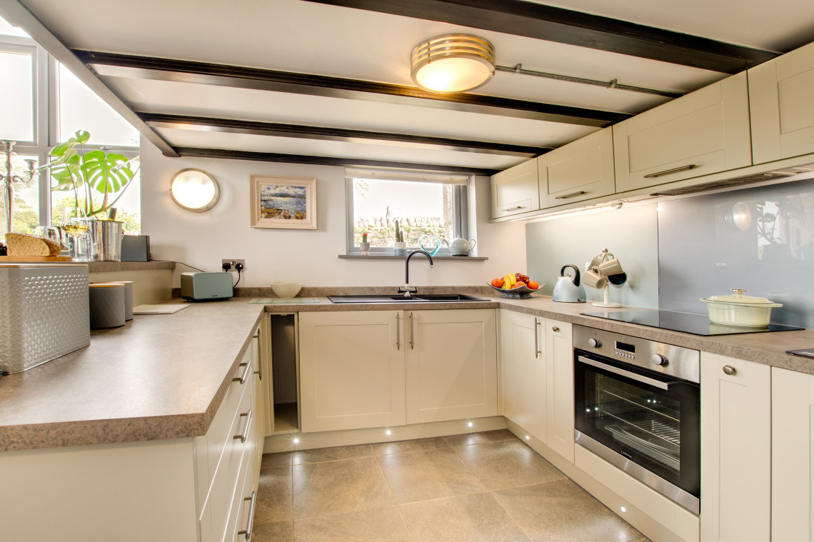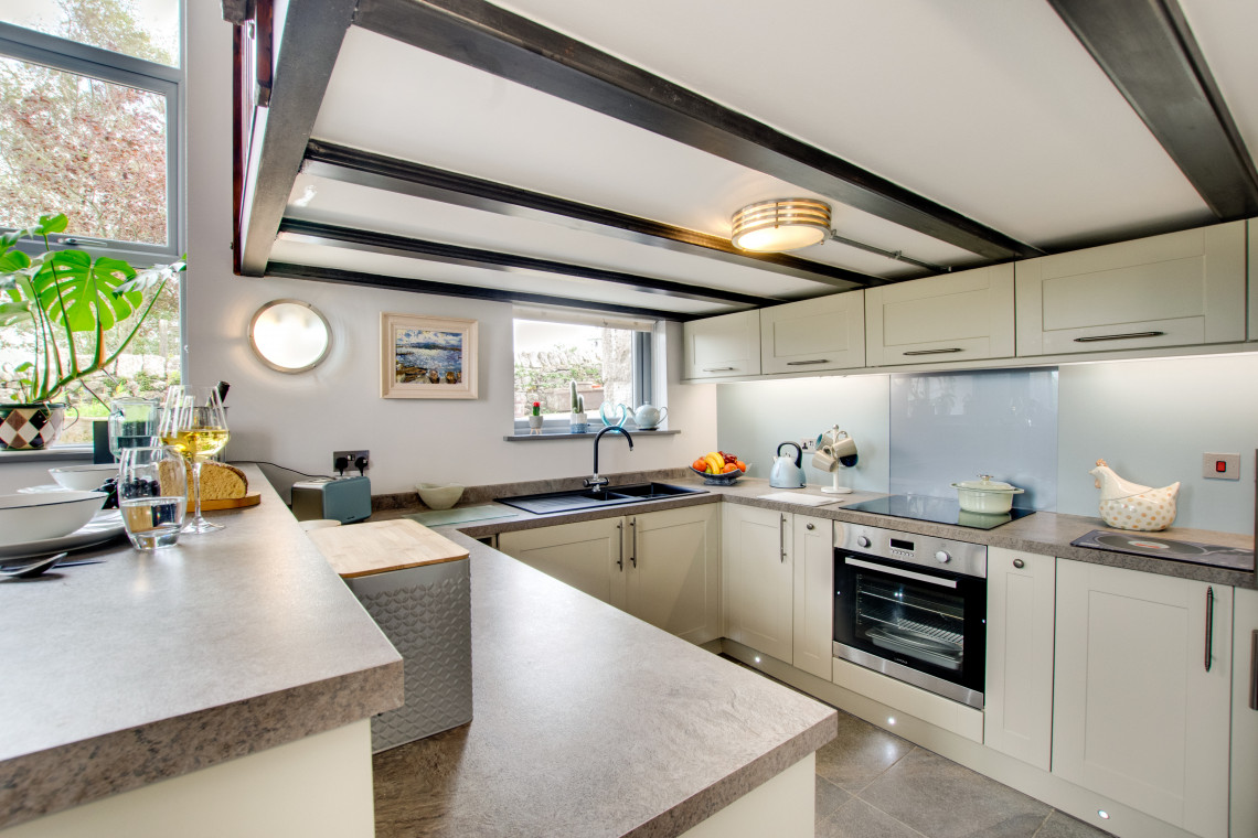 Kitchen: A Large well-equipped kitchen with electric hob and cooker, microwave, washing machine, fridge and freezer. Breakfast bar seats two.