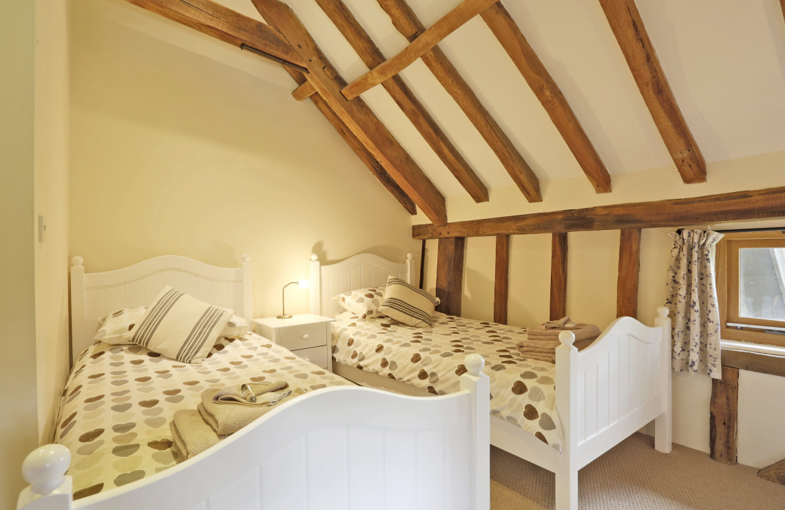 - Bedroom 2: twin beds, bedside table, lamps, chest of drawers. Hanging space in cupboard on landing.